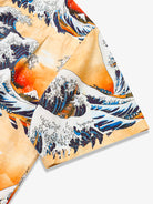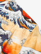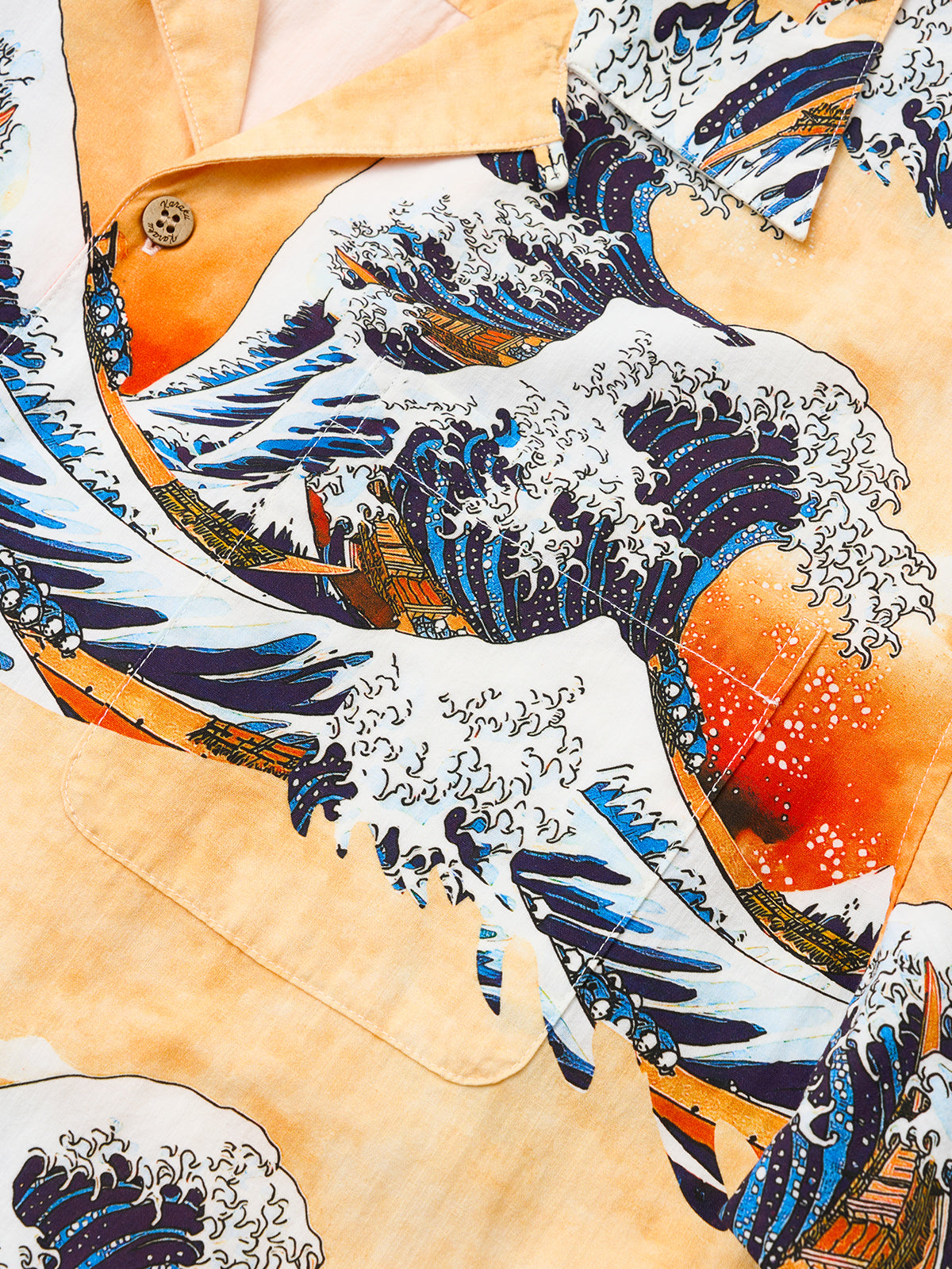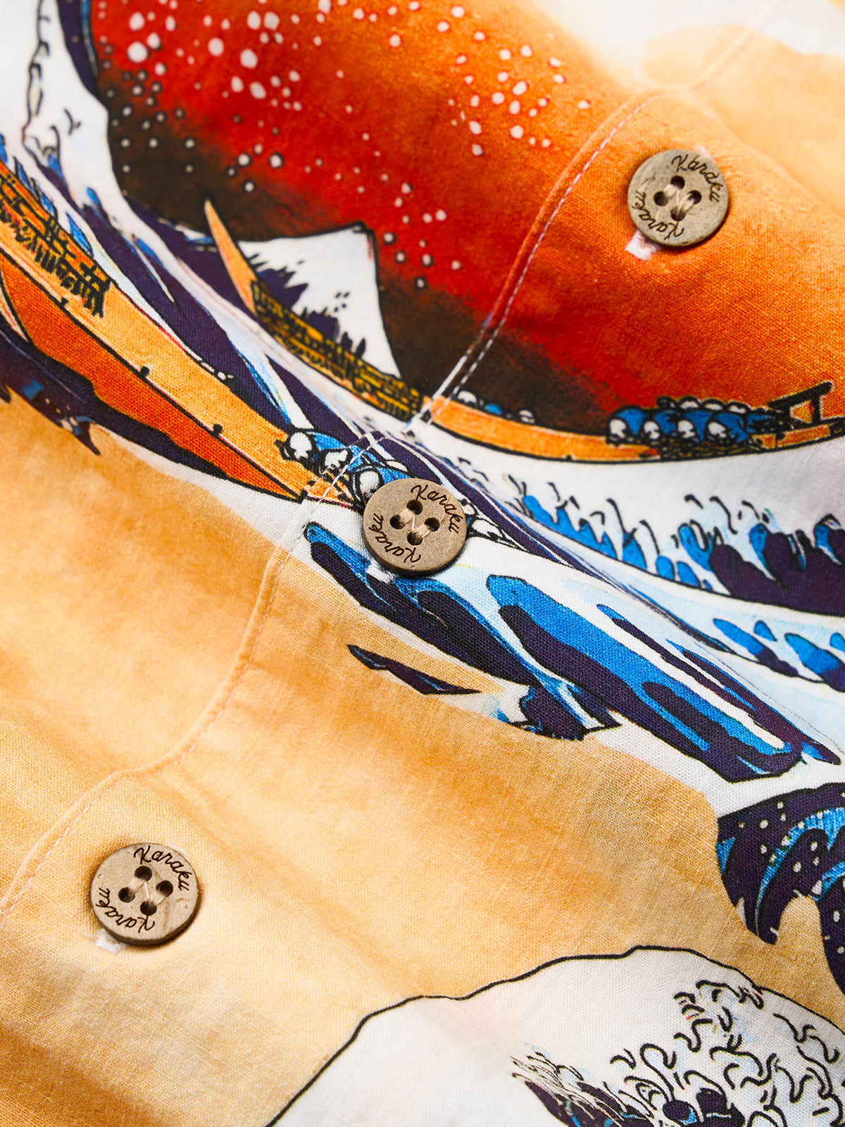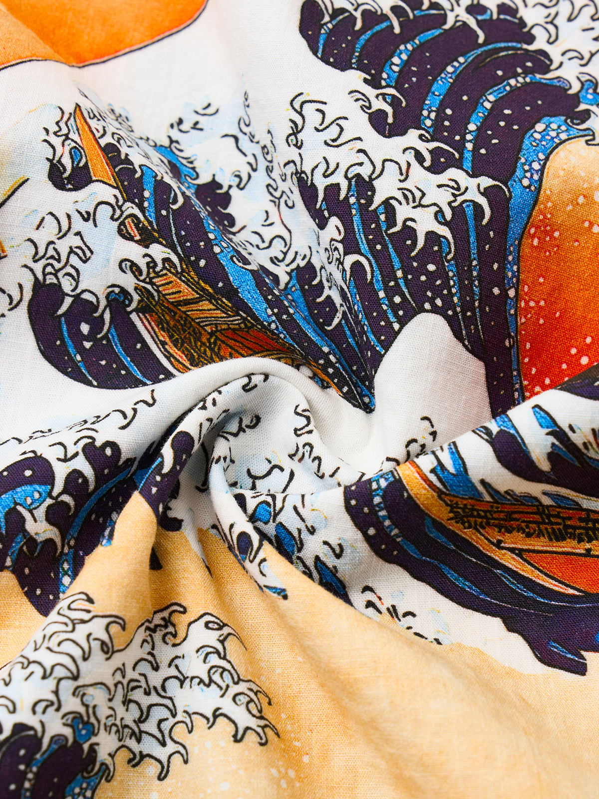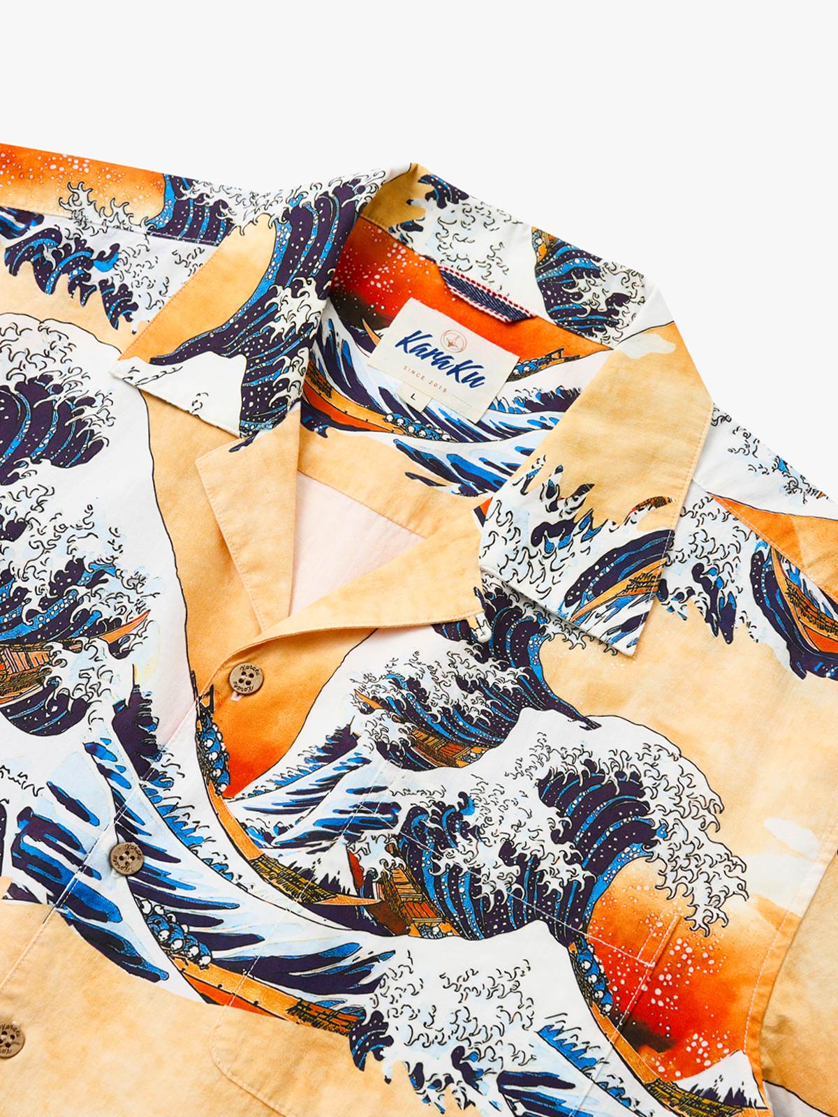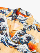 Inspired by the famous Japanese ukiyo-e master Hokusai's "The Great Wave off Kanagawa," this Hawaiian shirt blends traditional art with modern fashion. The pattern features majestic waves against a sunset backdrop, showcasing nature's grandeur and power. Made from 100% cotton with a camp collar, this shirt pays homage to classic art. Perfect for beach parties, casual outings, and art gallery visits.