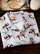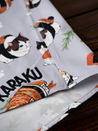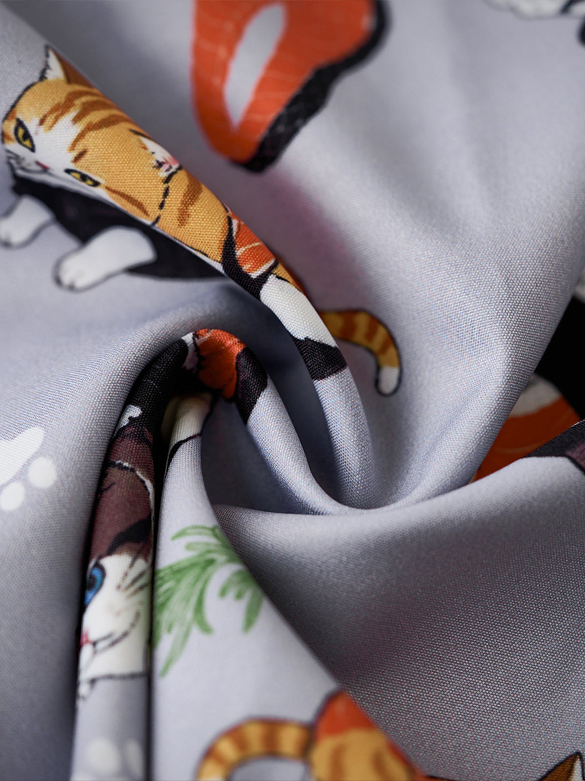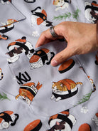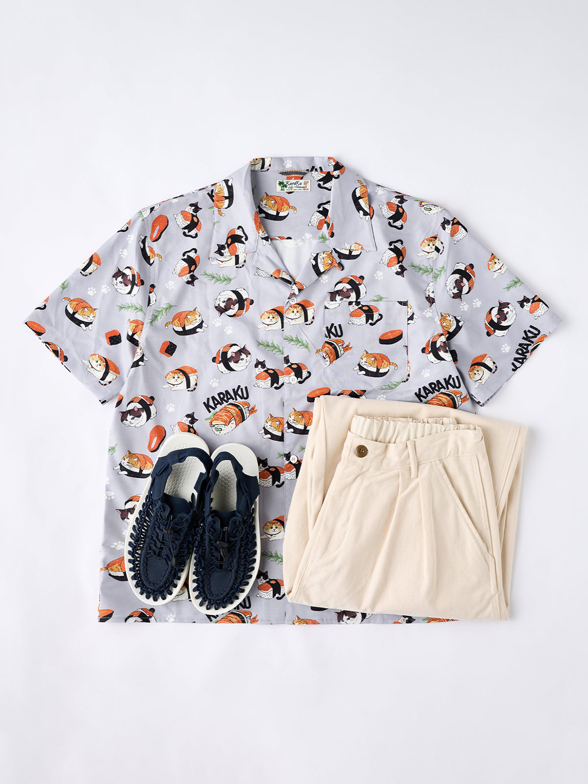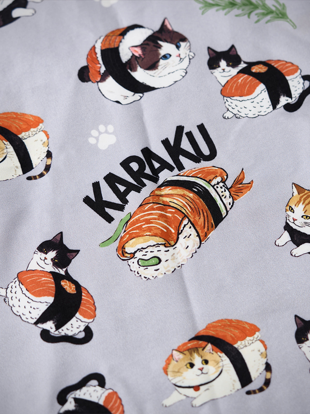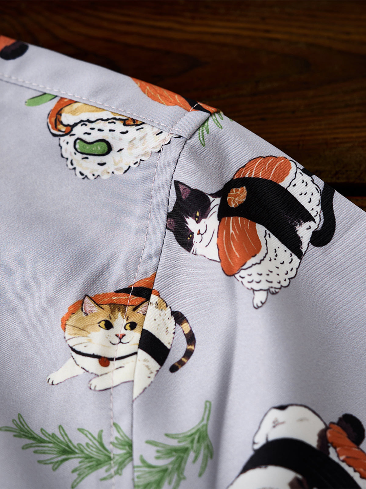 The whole shirt is designed to look like a cat turned into sushi. There are many kinds of sushi, and the cat is placed on top of the sand or wrapped in seaweed, giving a humorous and cute impression. As an all-over pattern, it is arranged so that you can enjoy the design from any angle. The style gives a casual and relaxed impression.