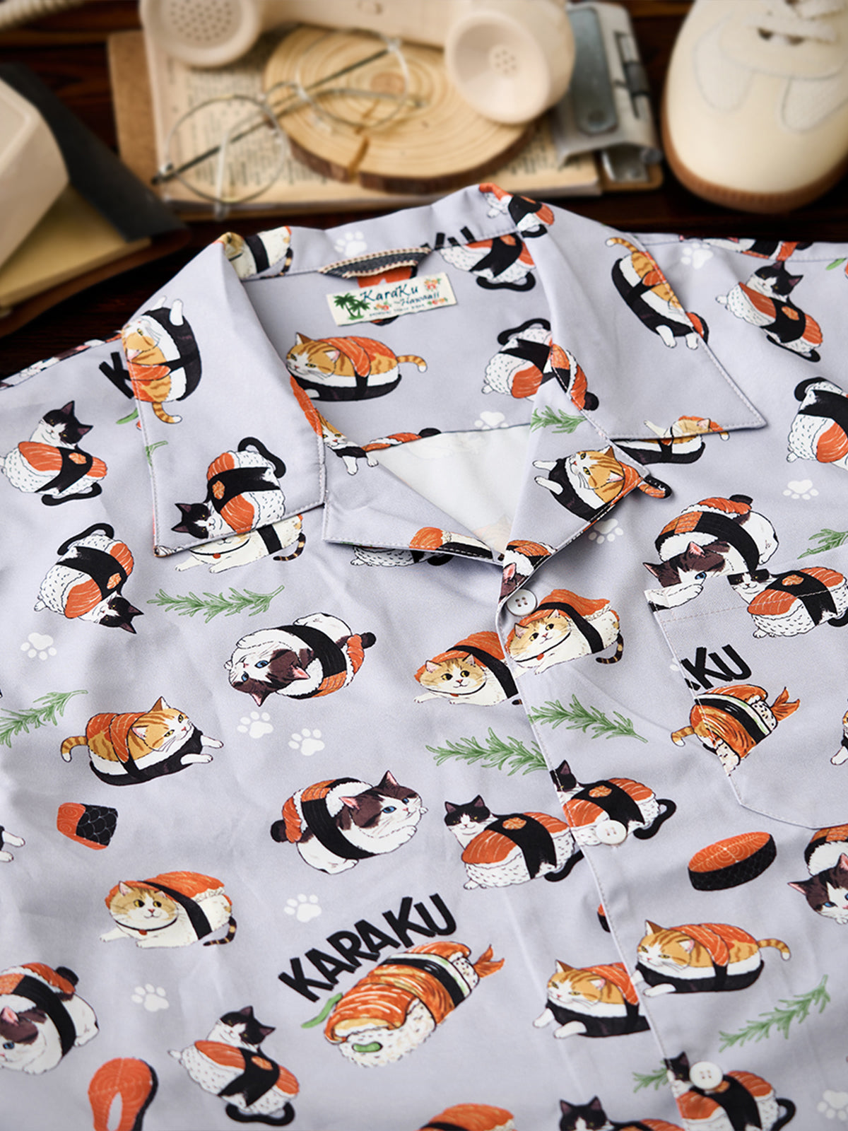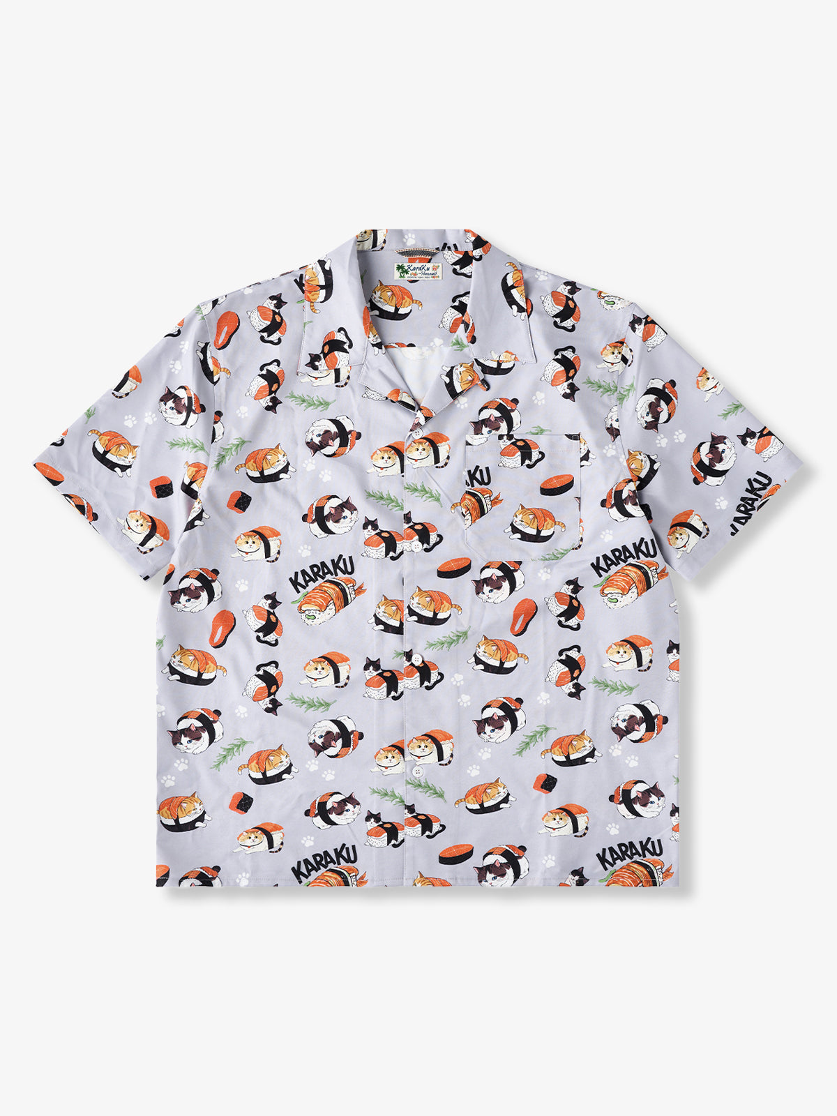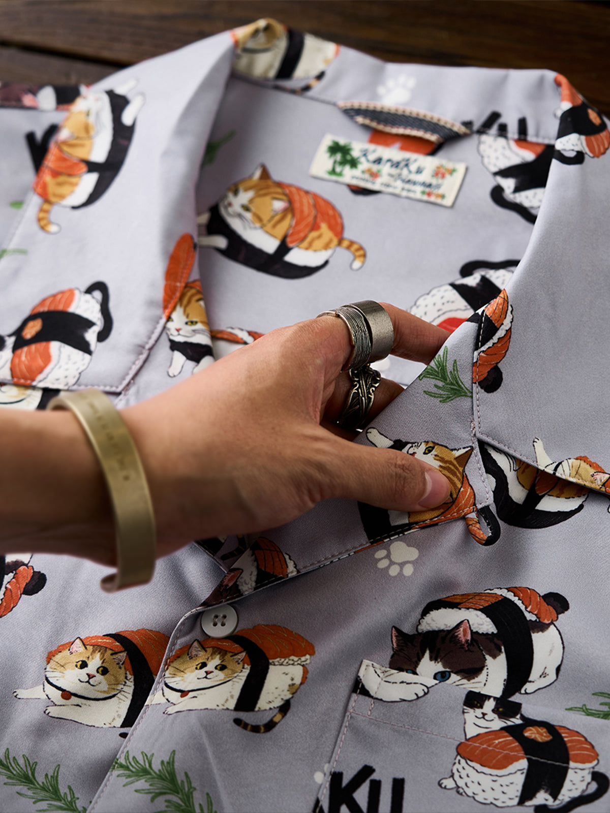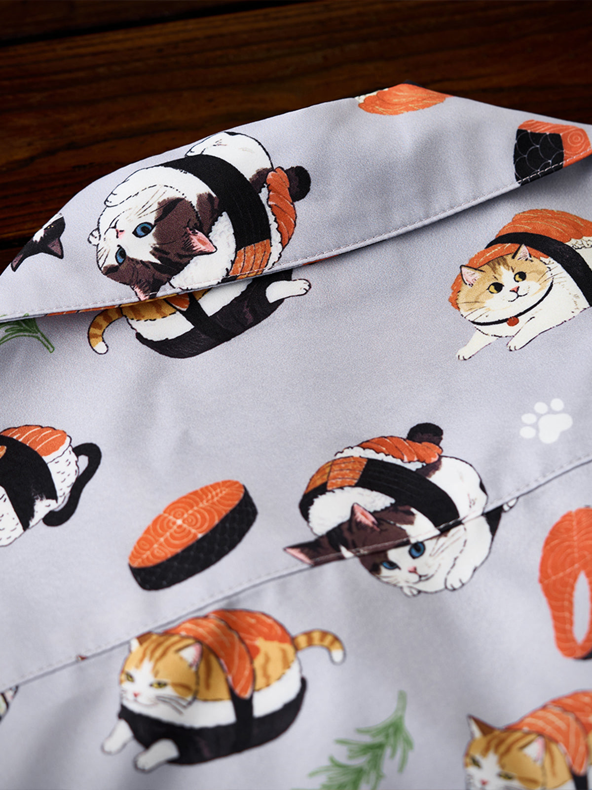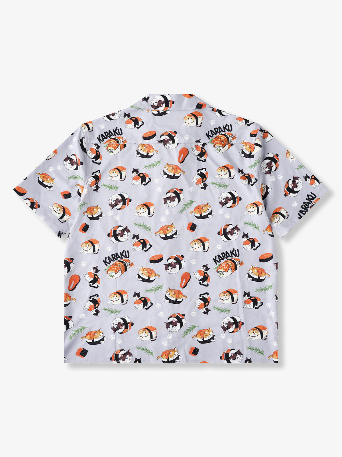 "Cat Sushi Encyclopedia" Handwritten Style Open Collar Shirt