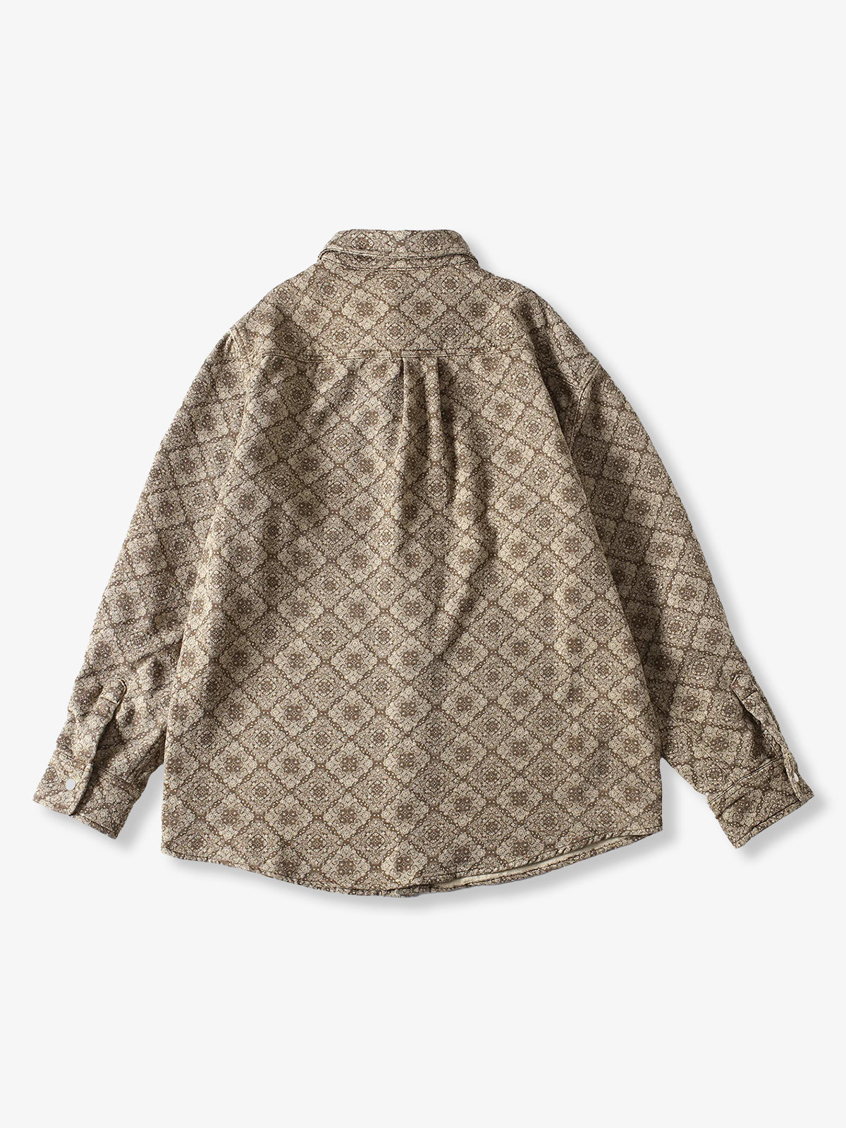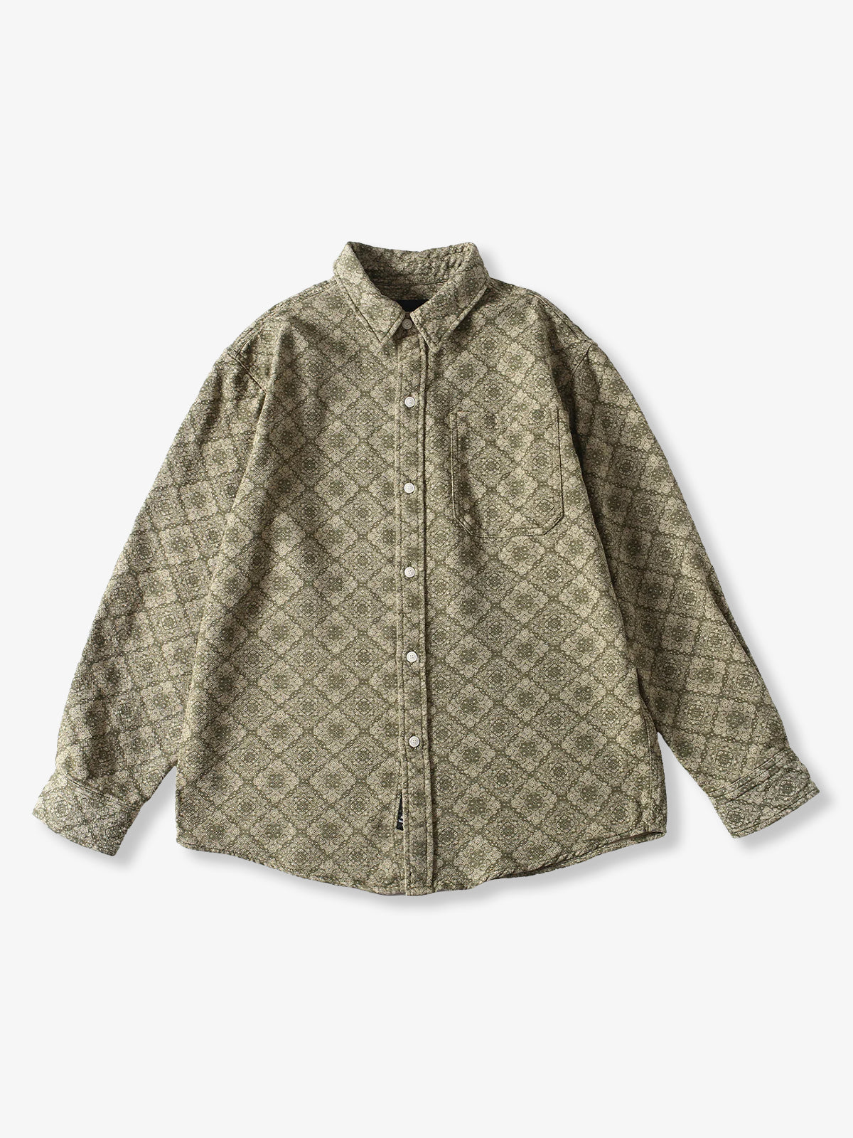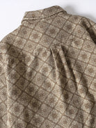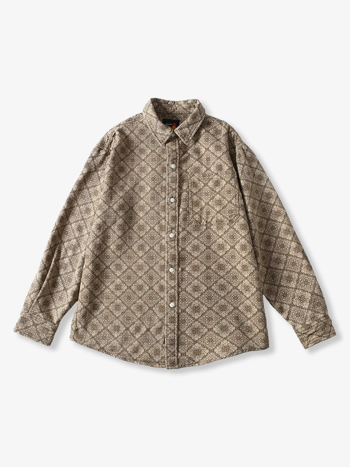 Long-sleeved shirt with a classic bandana pattern throughout. The all-over design is paired with delicate paisley and geometric patterns to create a retro feel. The rectangular bandana pattern is regularly arranged throughout the shirt, creating a sense of unity and balance. The silhouette is moderately spacious and can be worn not only as a single piece but also as a light outer cover. It can be matched with a variety of outfits from casual to street and American styles.