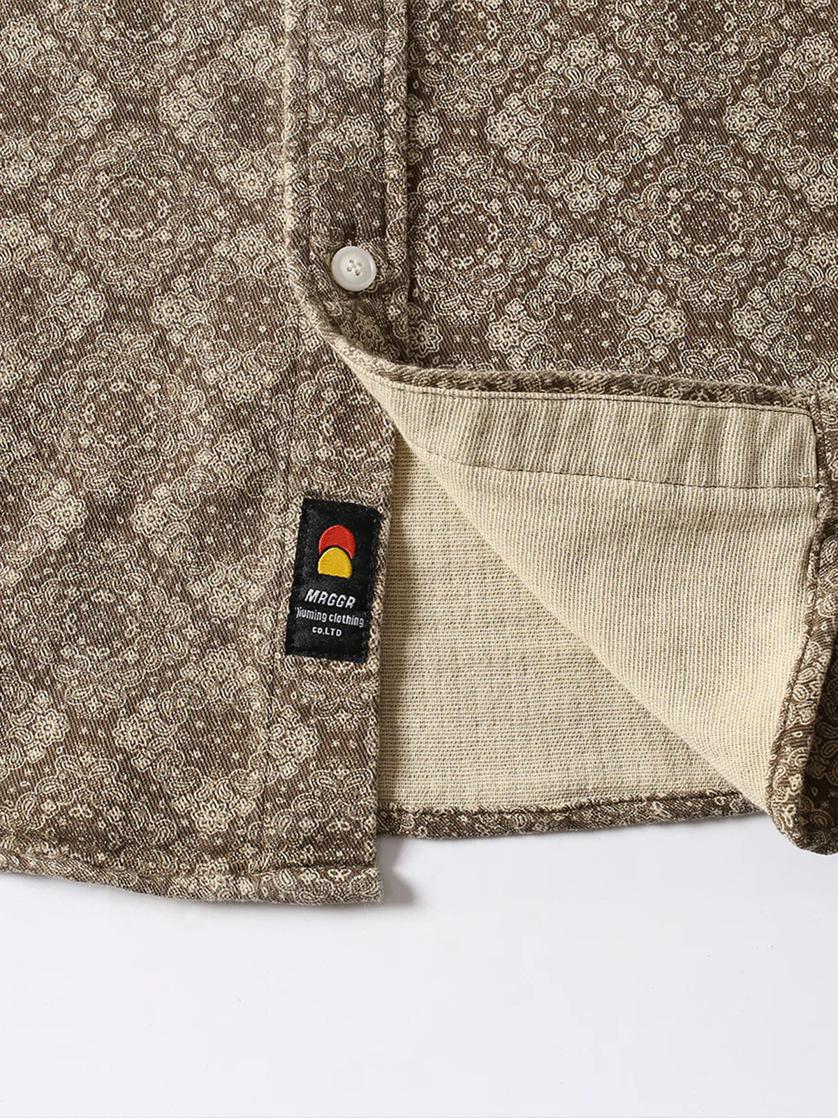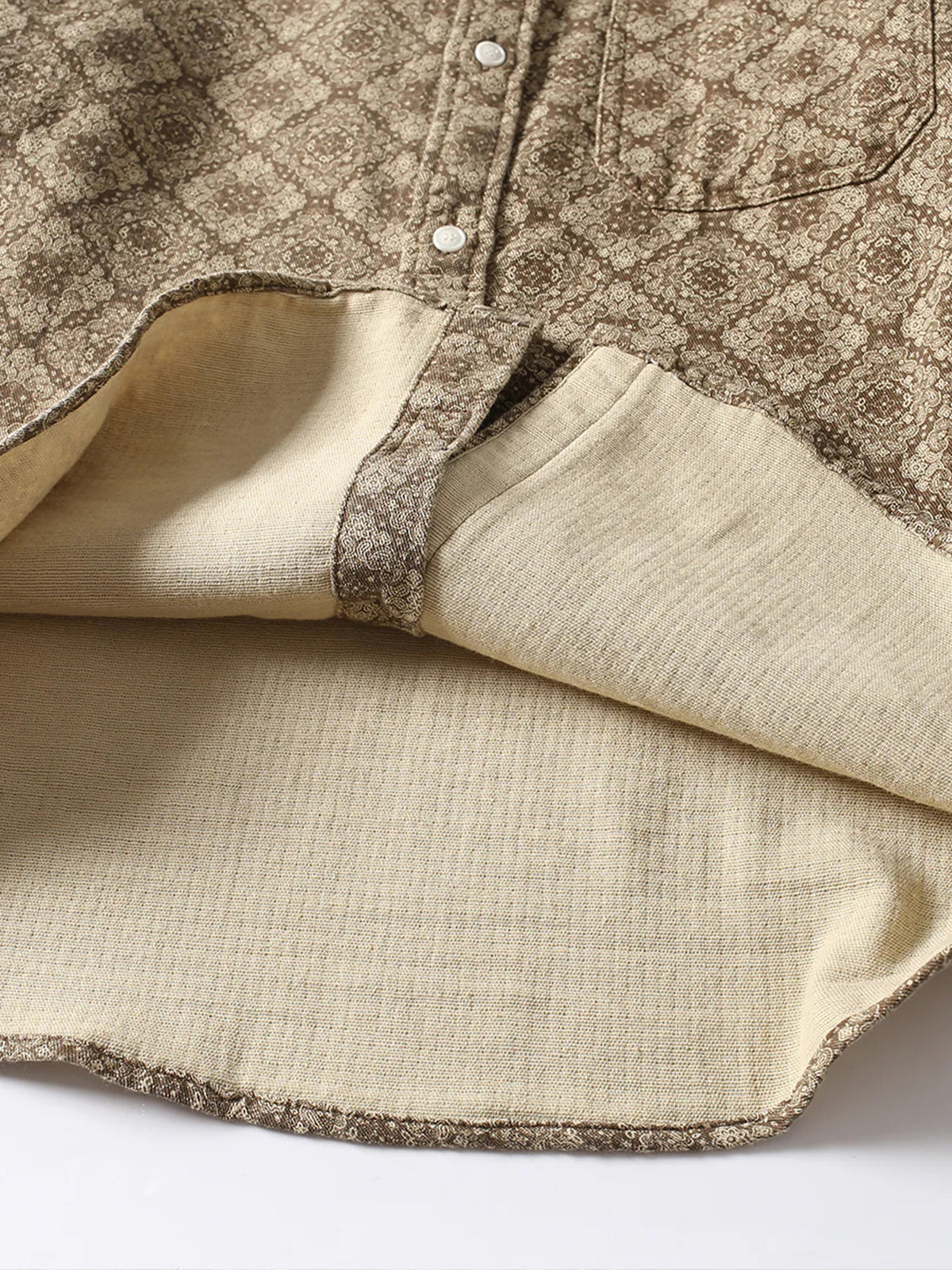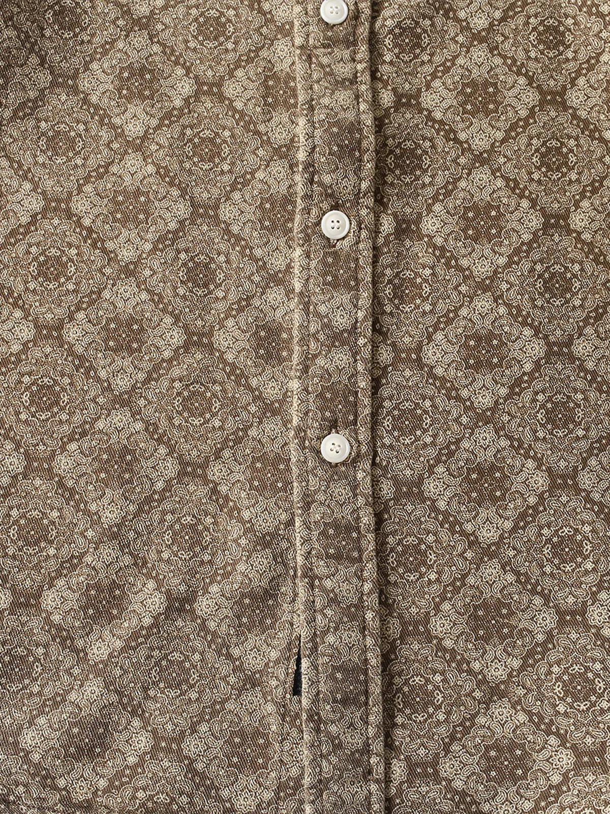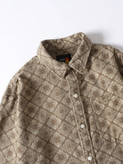 Long-sleeved shirt with a classic bandana pattern throughout. The all-over design is paired with delicate paisley and geometric patterns to create a retro feel. The rectangular bandana pattern is regularly arranged throughout the shirt, creating a sense of unity and balance. The silhouette is moderately spacious and can be worn not only as a single piece but also as a light outer cover. It can be matched with a variety of outfits from casual to street and American styles.