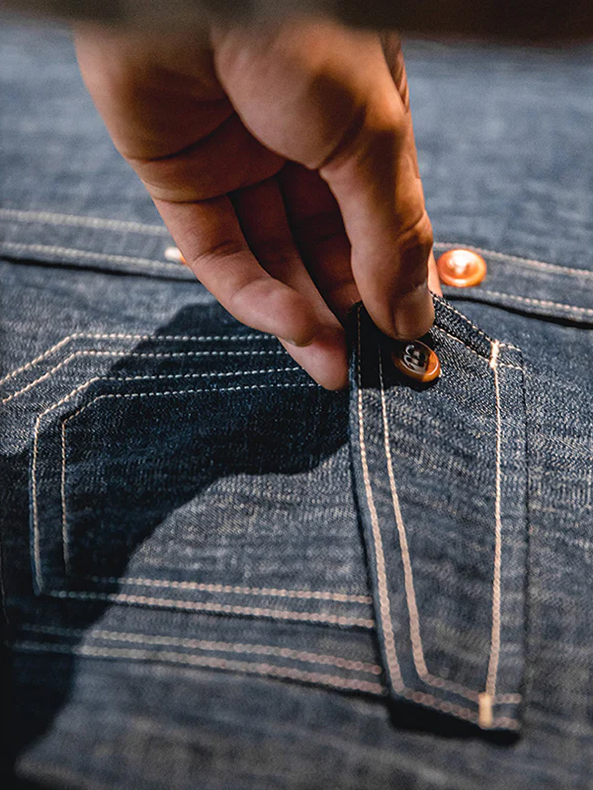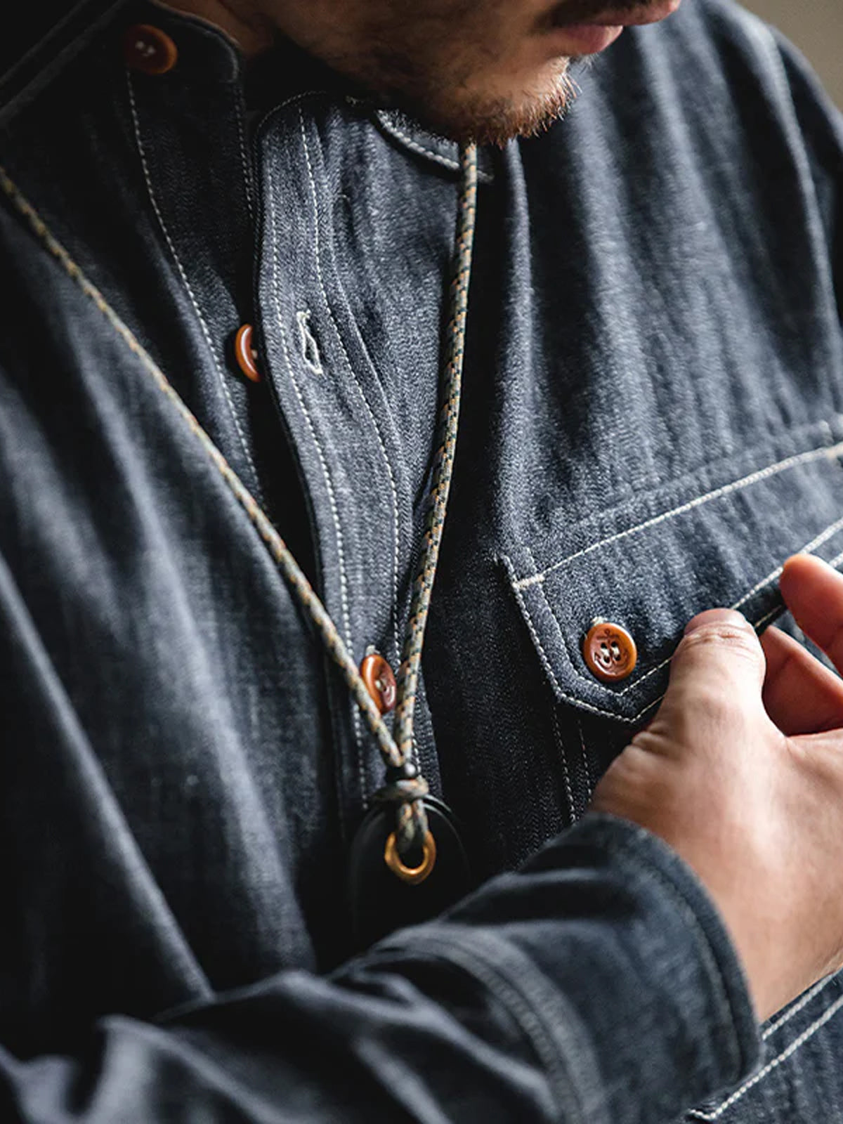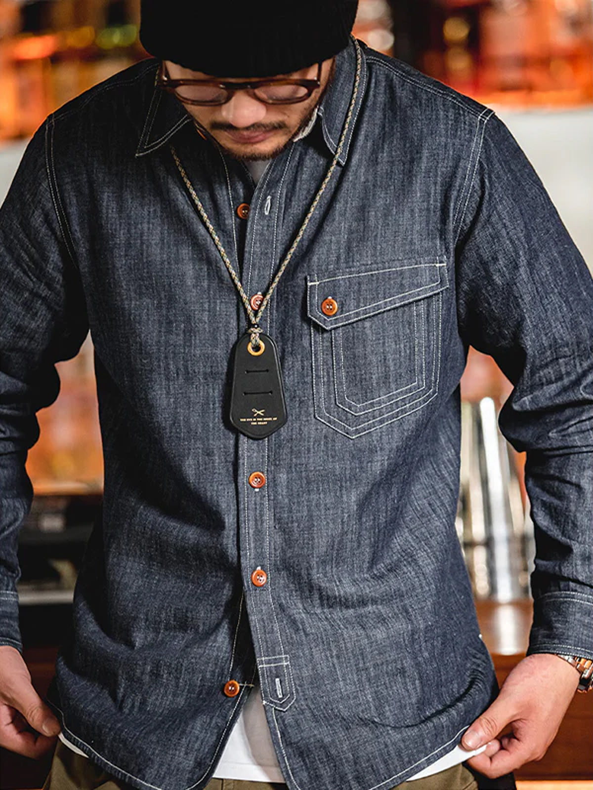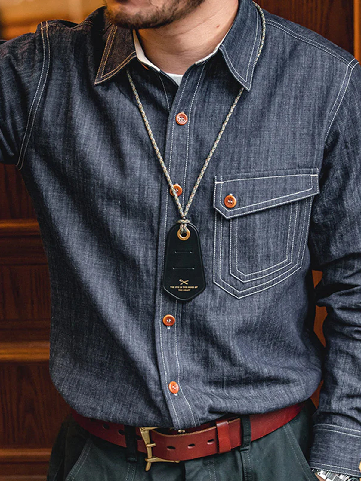 Inspired by the classic Navy CPO shirt, this denim shirt features large flap pockets and anchor buttons. Crafted from 100% cotton, it offers a perfect blend of softness and durability, with excellent moisture-wicking and quick-drying properties. Ideal as a lightweight outer layer, it's perfect for year-round wear, from casual outings to layering on cooler days.