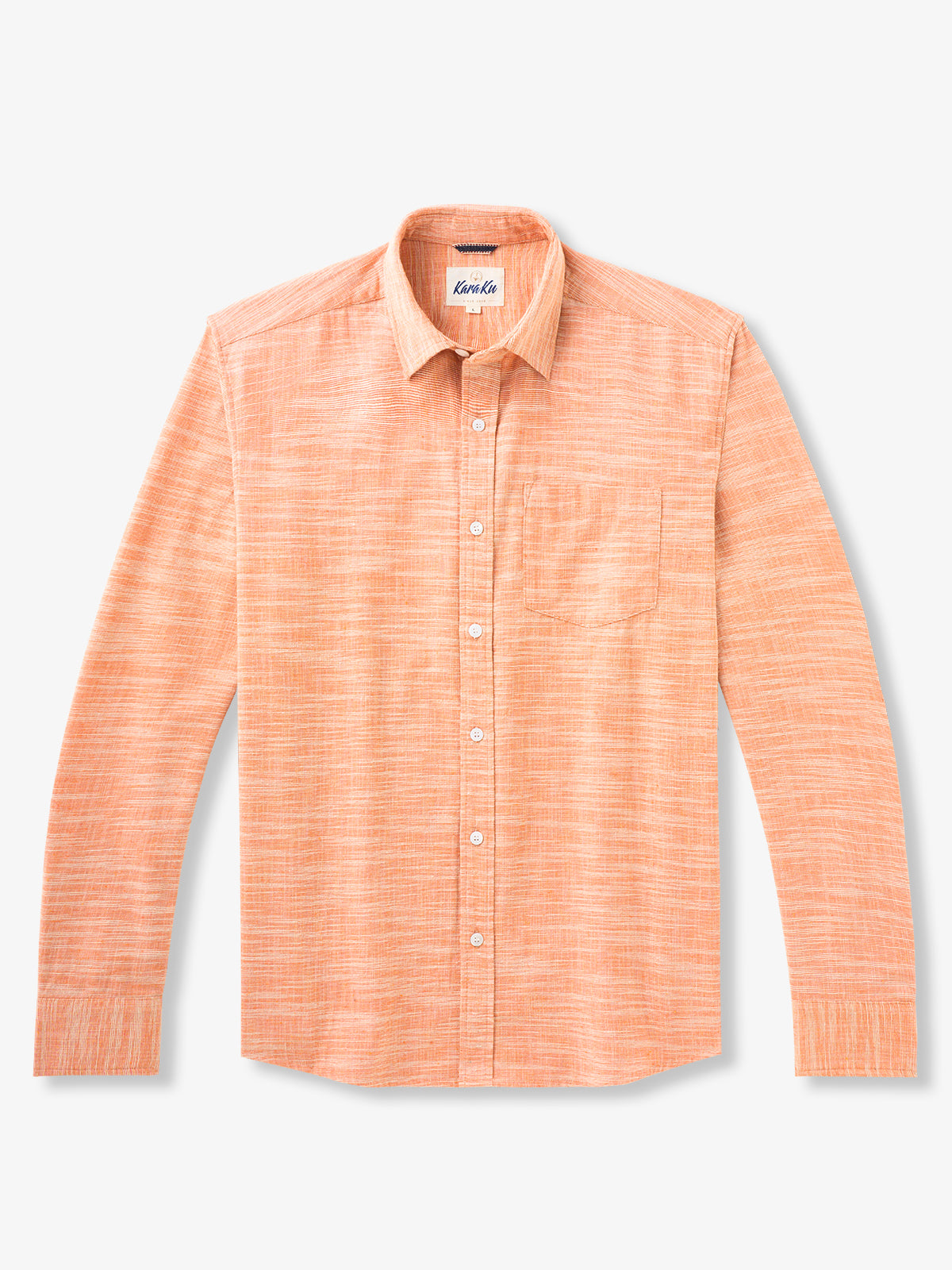 Inspired by retro aesthetics, this orange long sleeve shirt blends classic charm with modern comfort. Crafted from a cotton-linen blend, it offers breathable, lightweight fabric with a textured finish that adds subtle sophistication. Ideal for both casual outings and relaxed work environments, its vibrant color and unique texture make it a standout piece for adding a pop of style to any outfit.