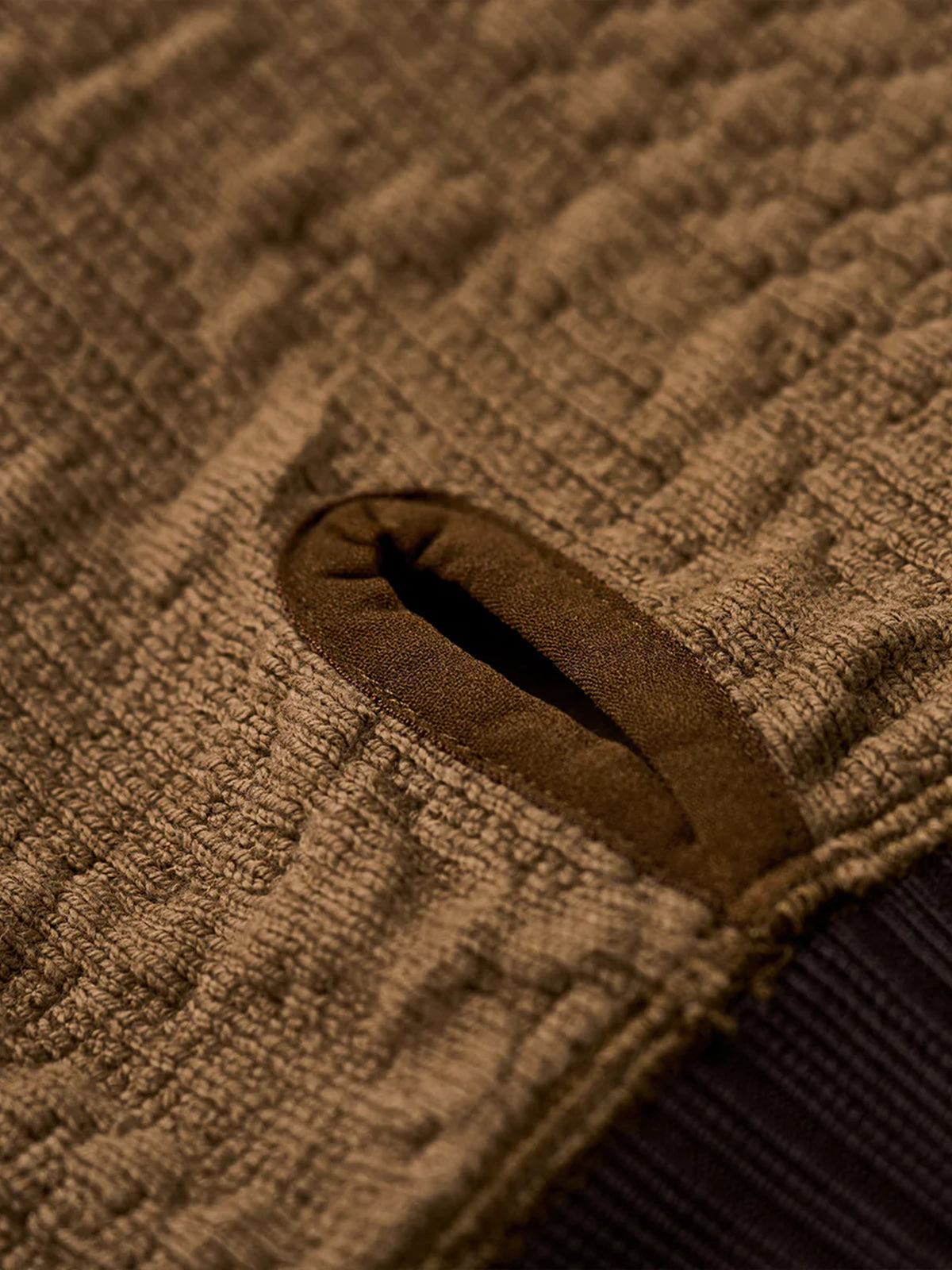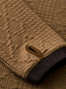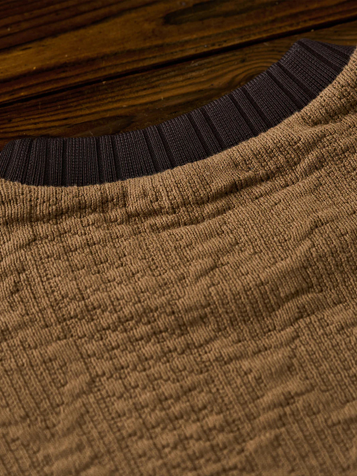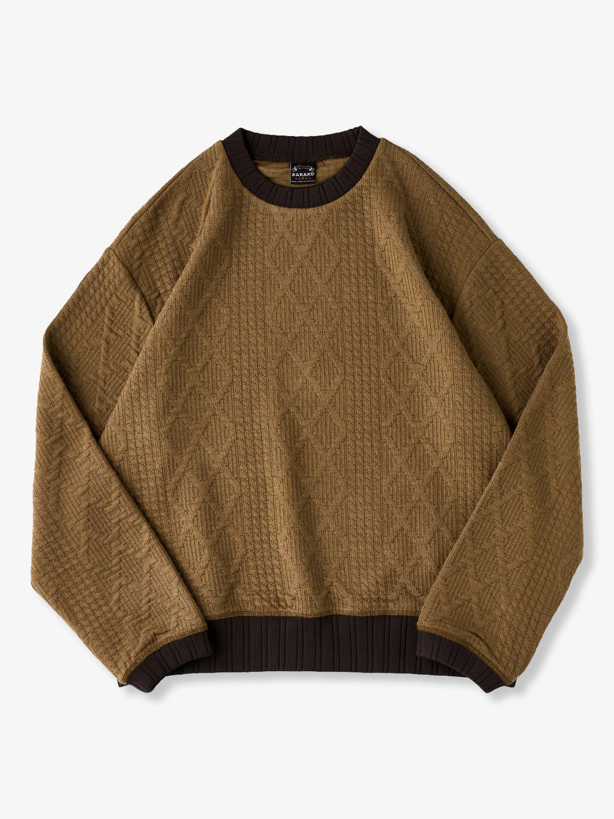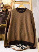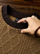 A sweatshirt designed to look like a classic cable-knit sweater, featuring a three-dimensional textured pattern made with soft sweatshirt fabric. It offers the comfort and ease of sweatwear while delivering the cozy look of knitwear, making it perfect for everyday wear. The contrasting color accents on the collar and hem add a subtle visual edge, keeping the design simple yet distinctive. Thumb holes at the cuffs provide extra functionality and warmth, ideal for outdoor or active settings. Blending knit-inspired style with practical comfort, this piece is a versatile staple for the fall and winter seasons.