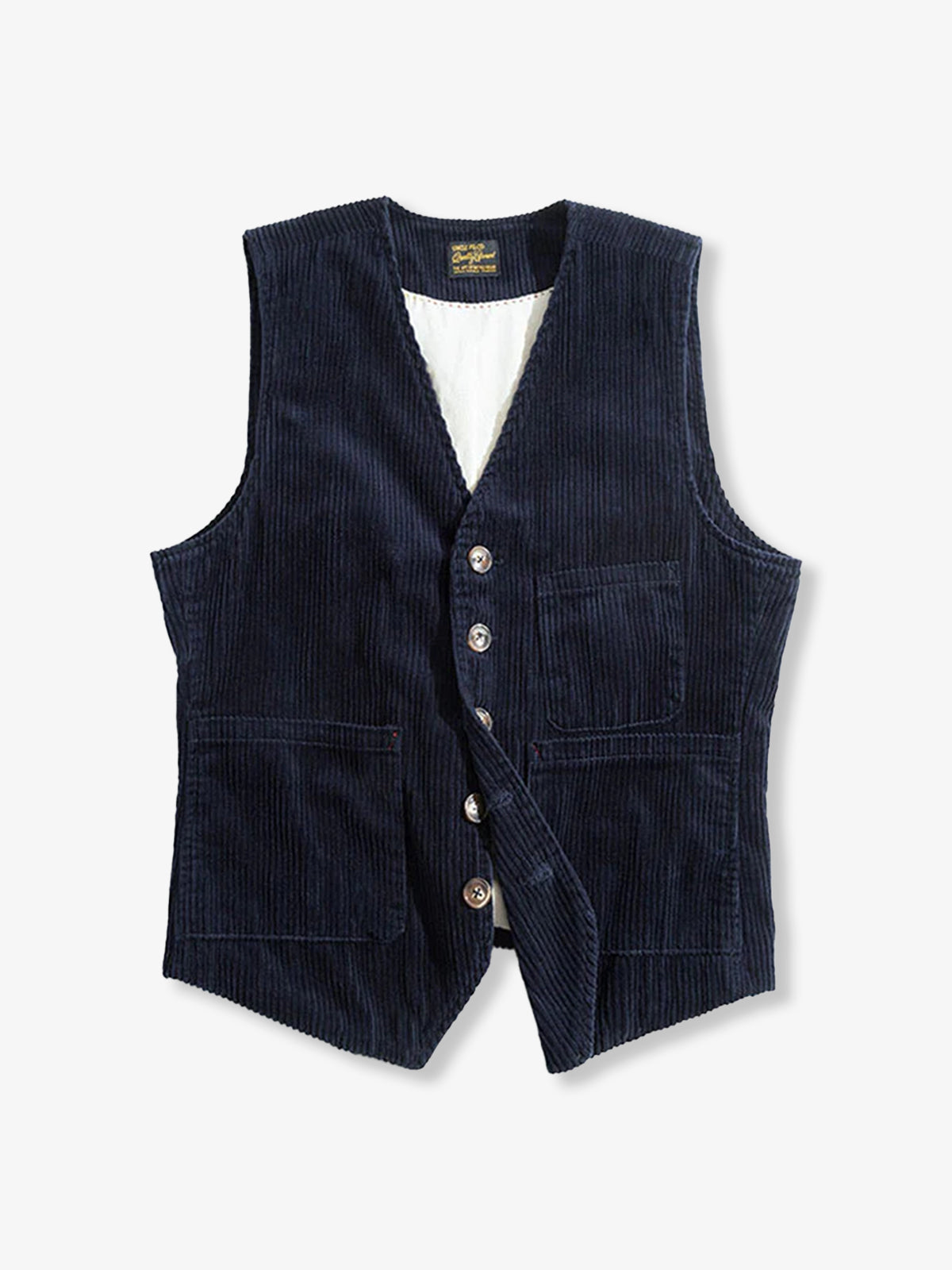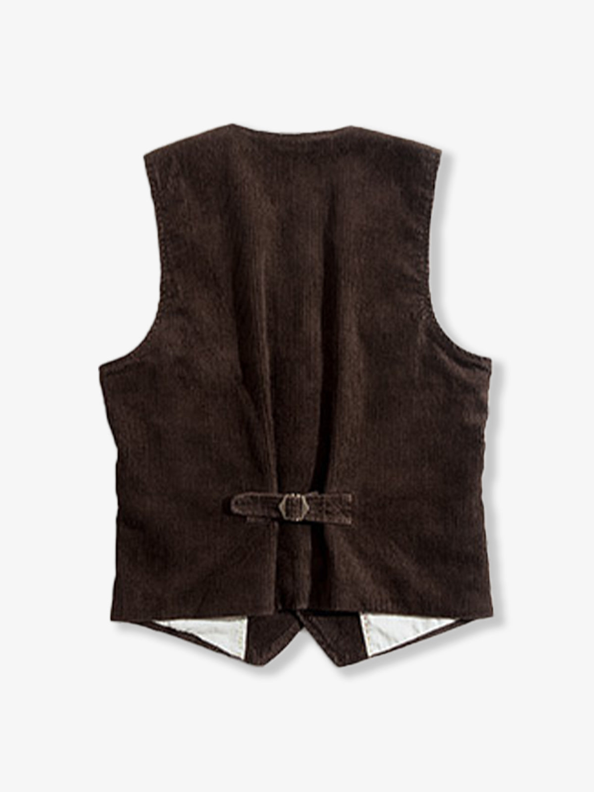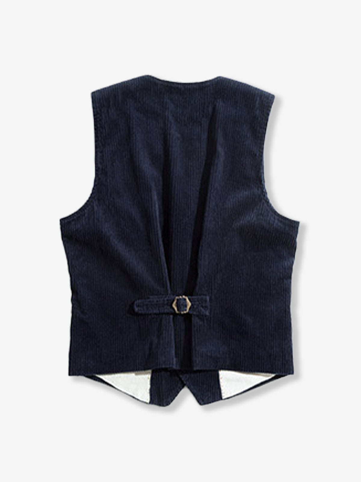 A V-neck work vest made of corduroy fabric. The material gives off a warm and cozy atmosphere characteristic of corduroy. As it is washed over time, it gradually fades in color, and the surface develops a soft, worn texture, creating a vintage-like look. The warm fabric makes it perfect for the autumn and winter seasons. Although it has a workwear-style texture, the V-neck design adds a refined touch, allowing it to pair well not only with shirts but also with T-shirts and sweatshirts. Designed with layering in mind, it features a slightly relaxed width and shoulder fit. A matching bottom made from the same fabric is also available, making it ideal for styling as a classic set-up look.