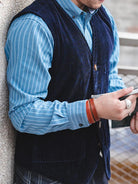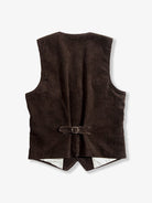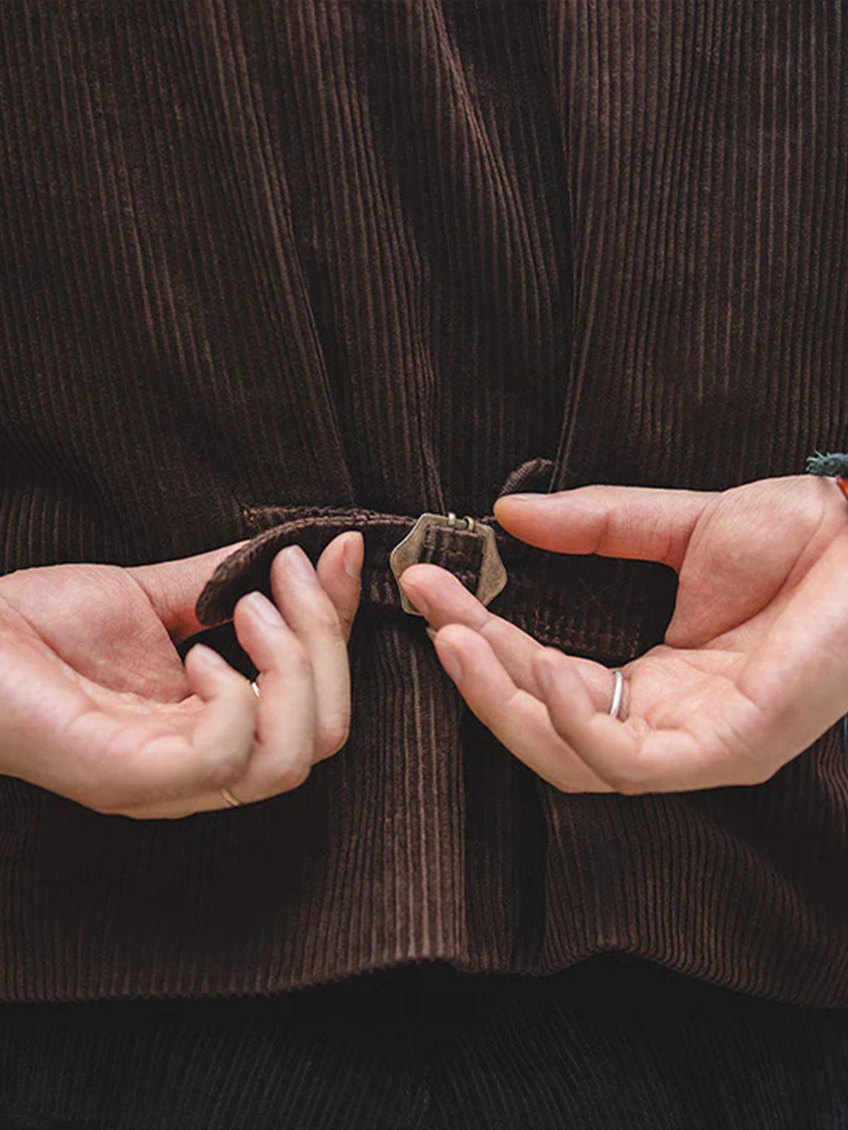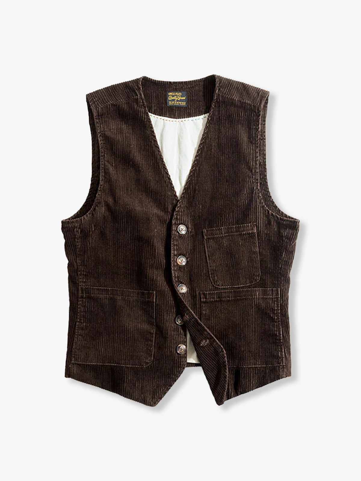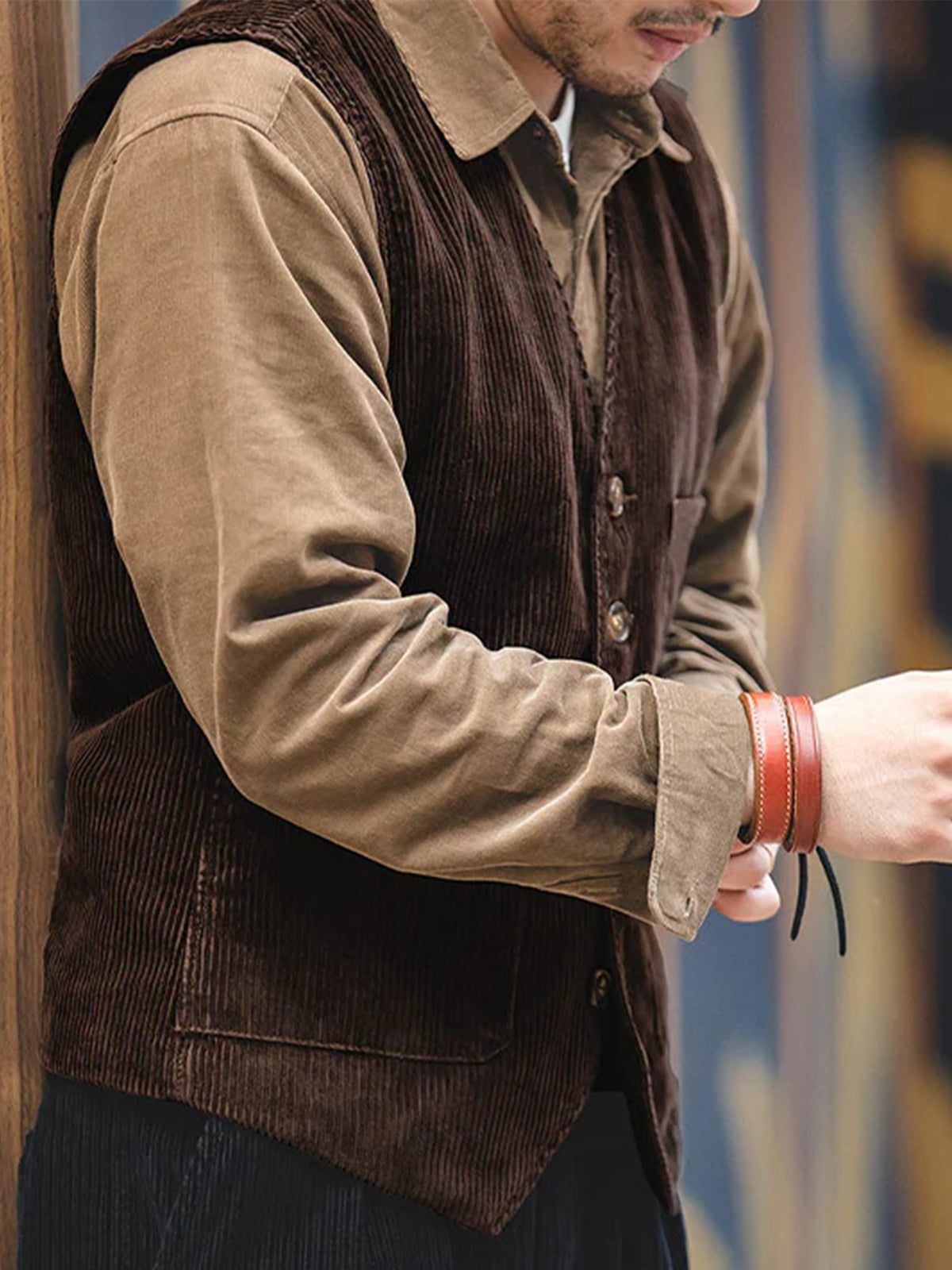 A V-neck work vest made of corduroy fabric. The material gives off a warm and cozy atmosphere characteristic of corduroy. As it is washed over time, it gradually fades in color, and the surface develops a soft, worn texture, creating a vintage-like look. The warm fabric makes it perfect for the autumn and winter seasons. Although it has a workwear-style texture, the V-neck design adds a refined touch, allowing it to pair well not only with shirts but also with T-shirts and sweatshirts. Designed with layering in mind, it features a slightly relaxed width and shoulder fit. A matching bottom made from the same fabric is also available, making it ideal for styling as a classic set-up look.