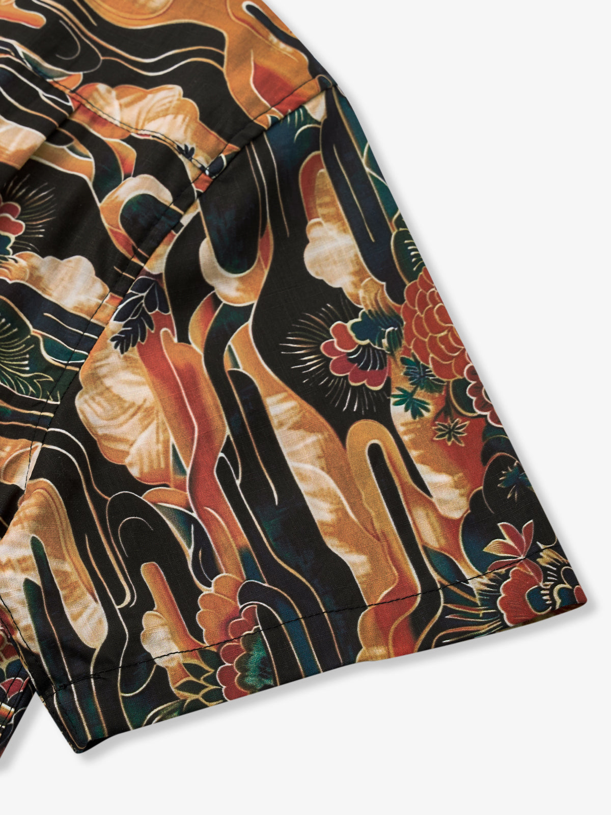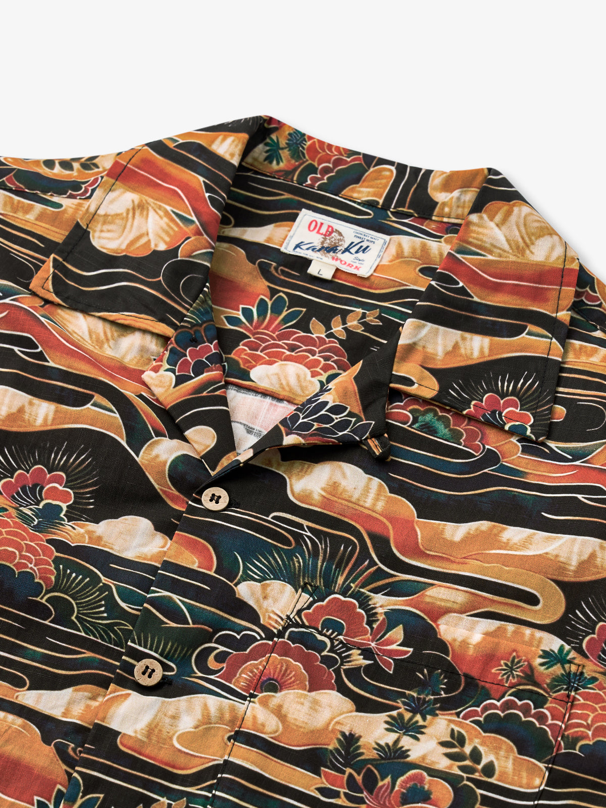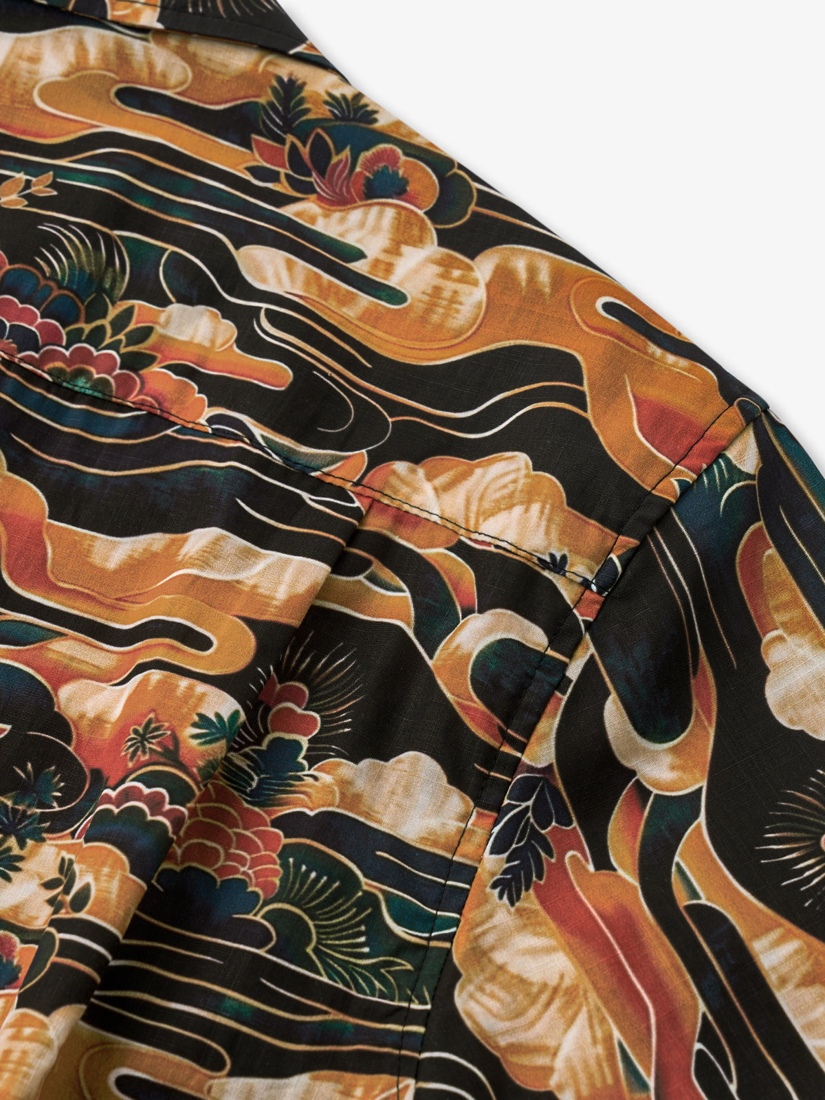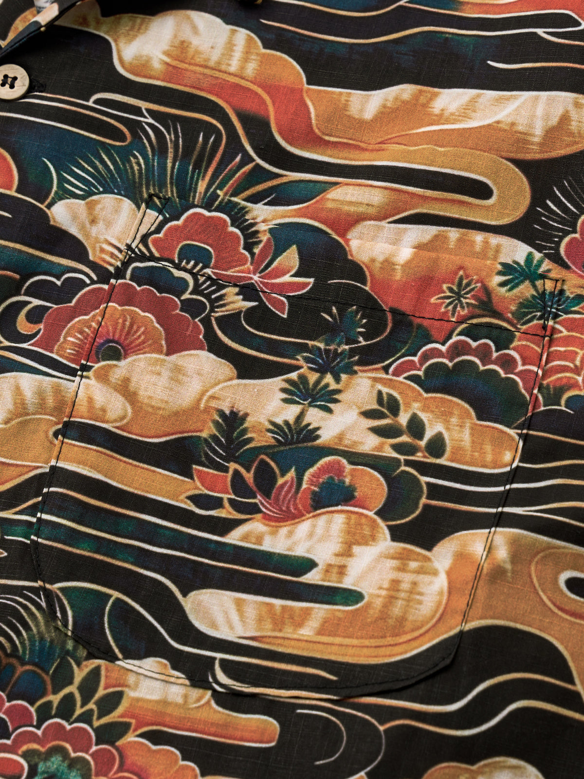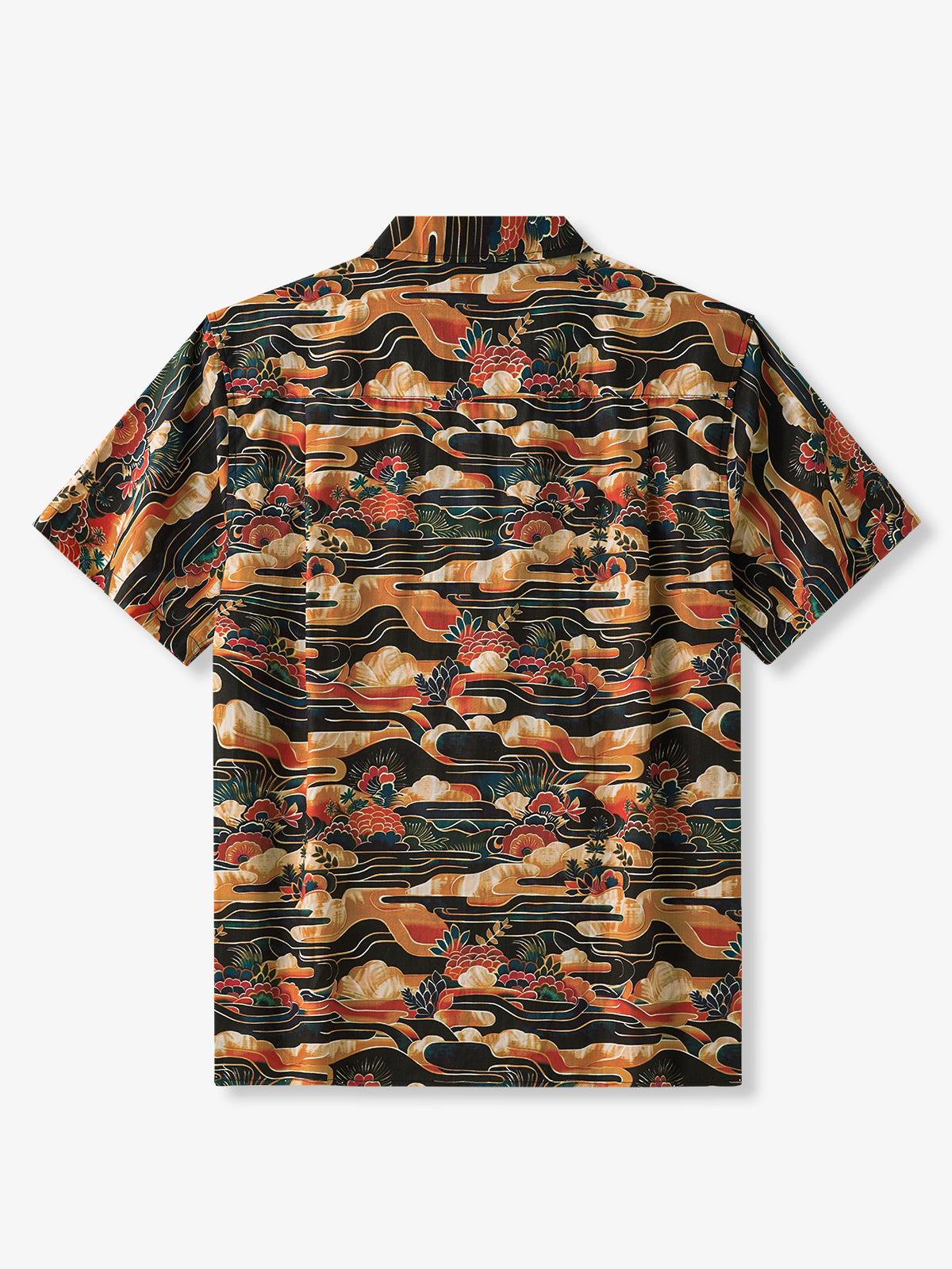 Ukiyo-e Inspired Waves & Clouds & Flowers Cotton Camp Shirt