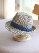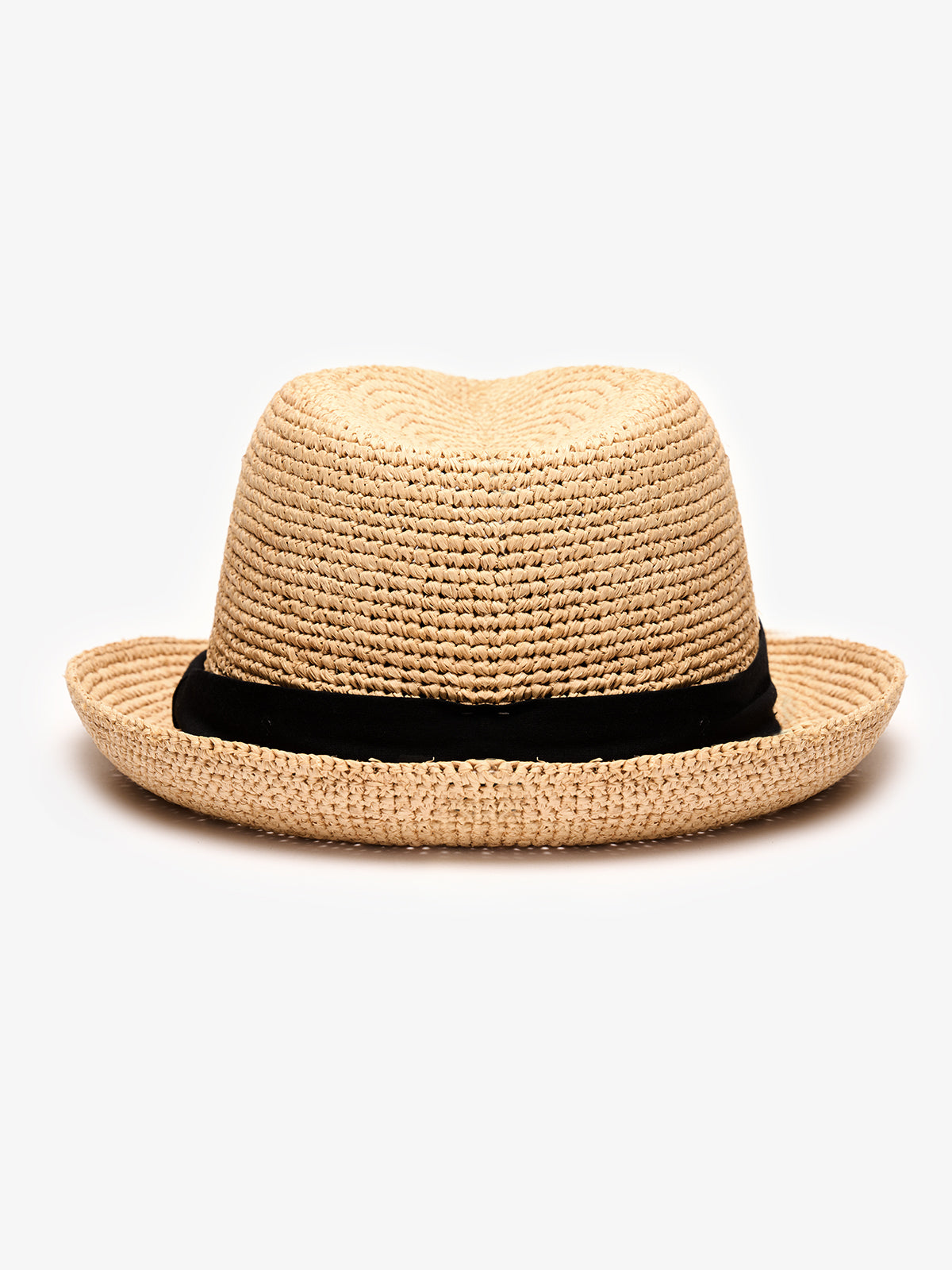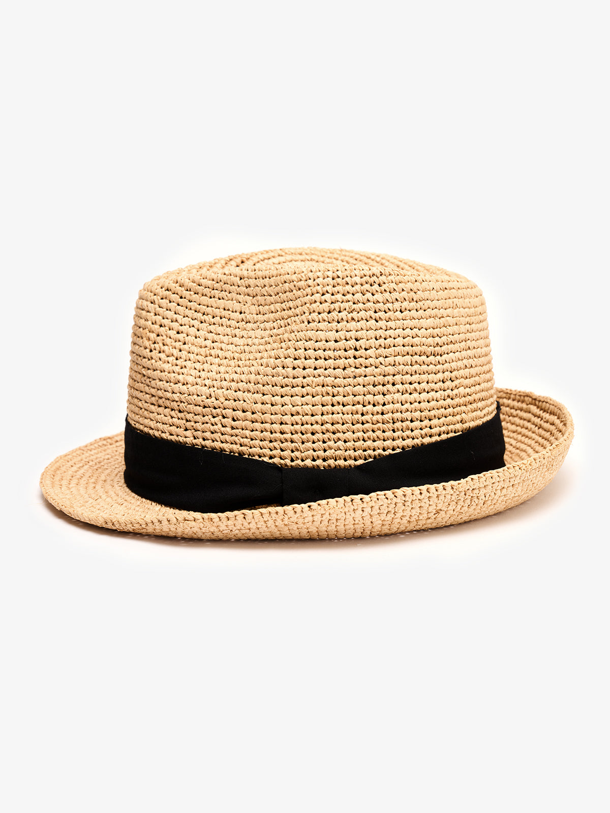 Crafted from raffia palm materials, this hat features a unique, timeless design for effortless elegance. Trimmed with a grosgrain ribbon and a comfortable sweatband, it combines style and comfort seamlessly.
