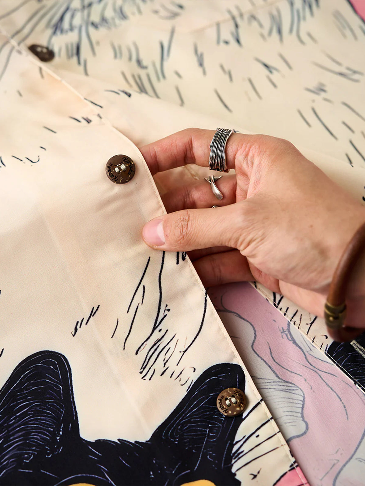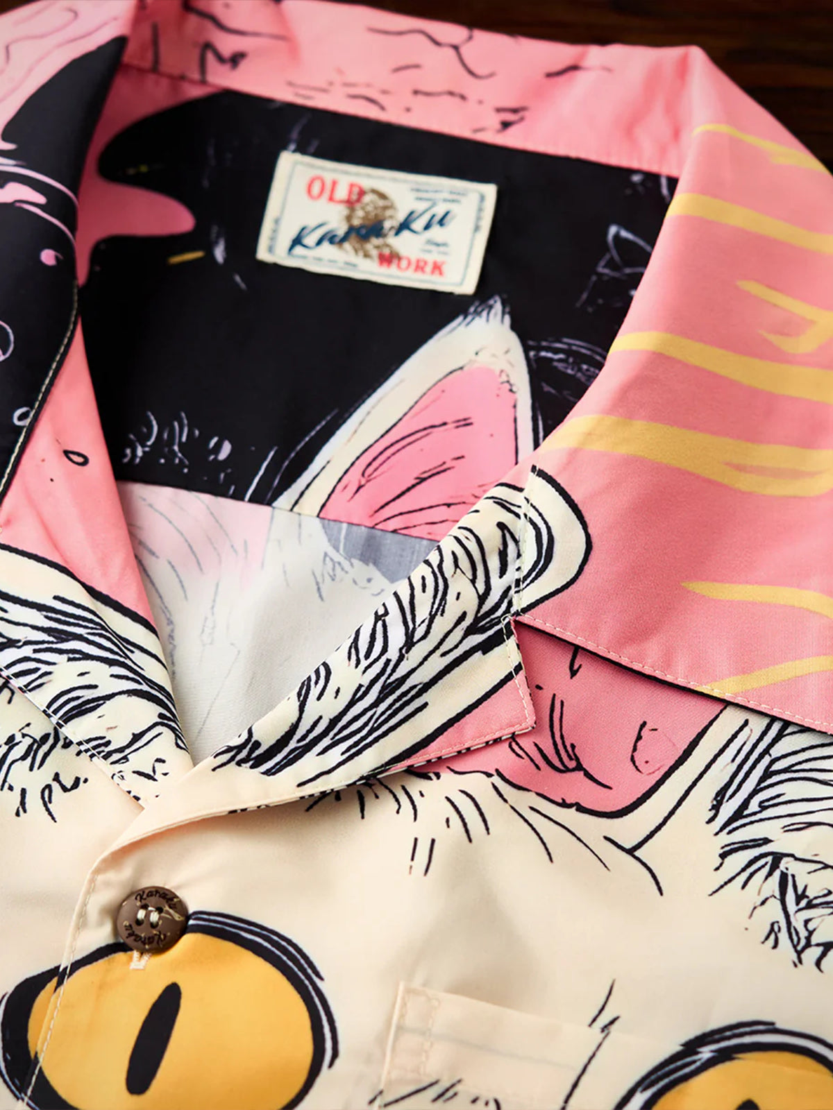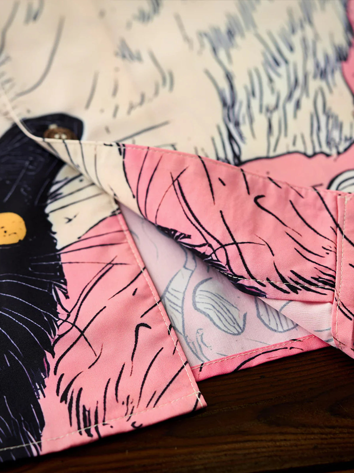 A Tencel-like Aloha shirt that is perfect for the lighthearted mood of spring. This cat is wrapped in pink like a pleat and is still dreaming today. Look up at the sky and ride on the clouds. The graphics on the front and back tell different stories. The coloring based on soft pink creates a soft impression like spring. This is a piece that is both playful and seasonal, becoming the star of the show in one.