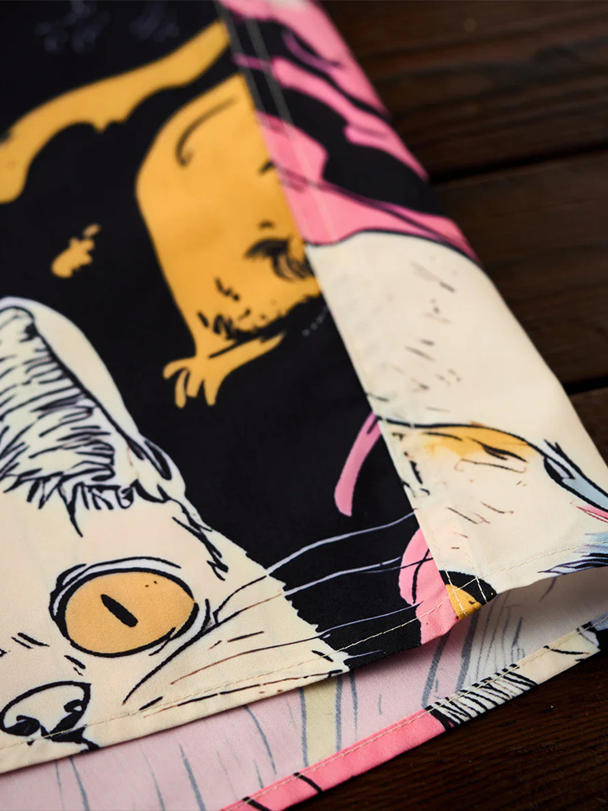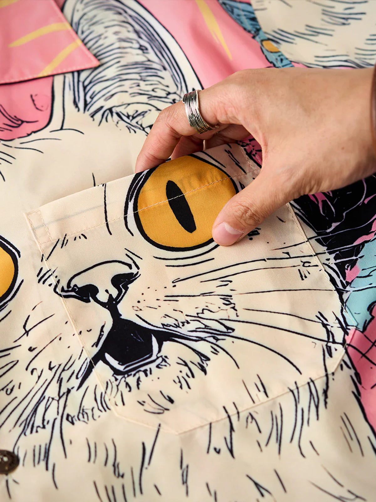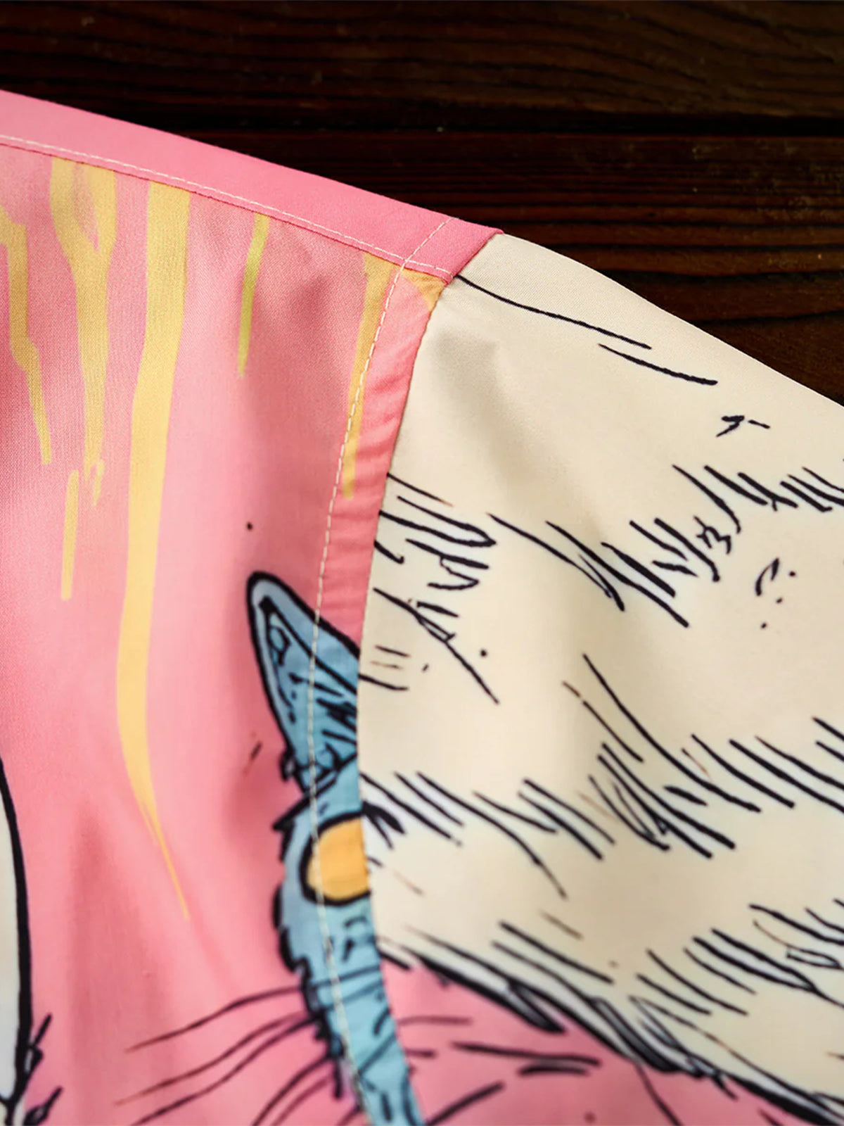 A Tencel-like Aloha shirt that is perfect for the lighthearted mood of spring. This cat is wrapped in pink like a pleat and is still dreaming today. Look up at the sky and ride on the clouds. The graphics on the front and back tell different stories. The coloring based on soft pink creates a soft impression like spring. This is a piece that is both playful and seasonal, becoming the star of the show in one.