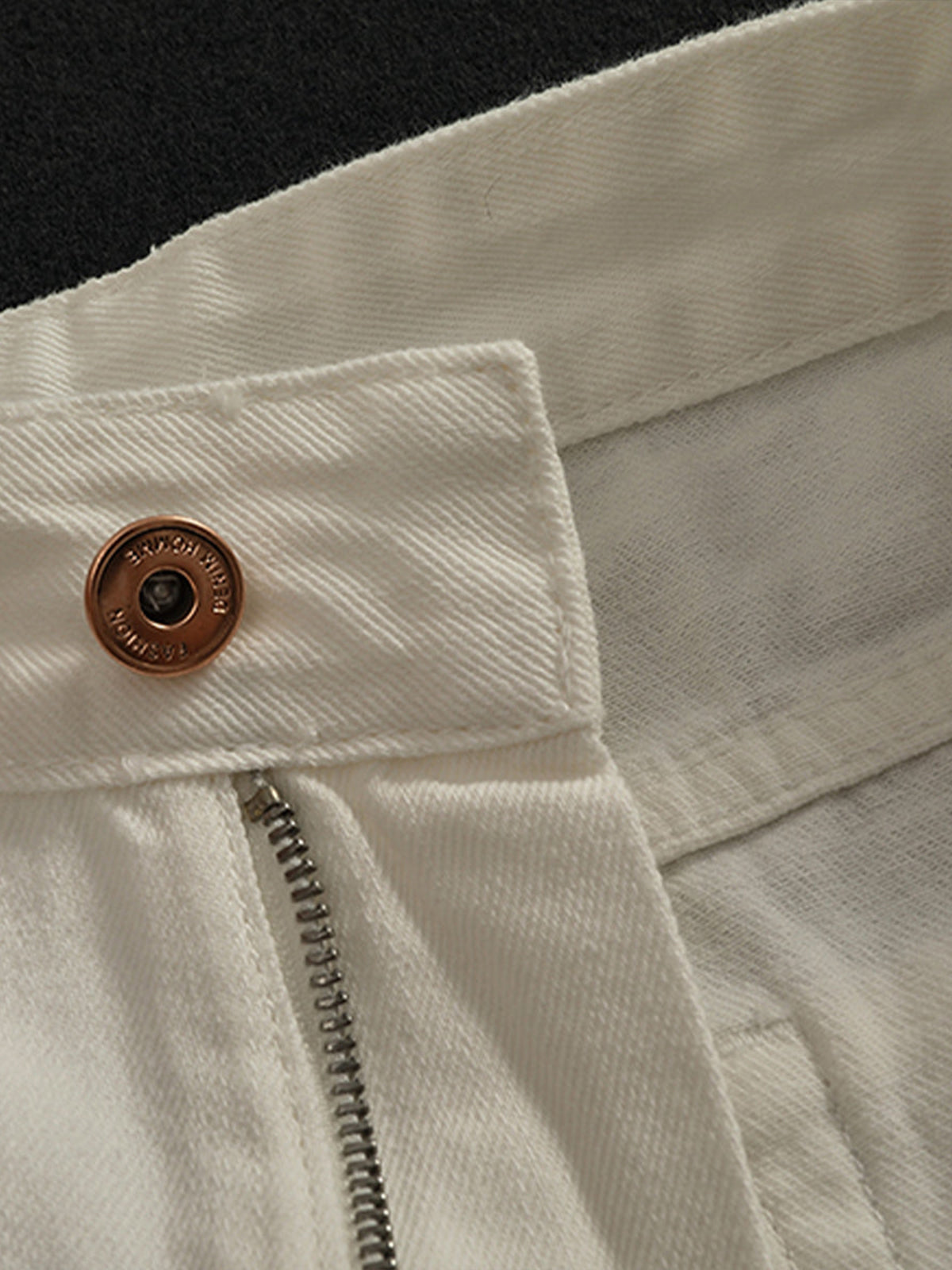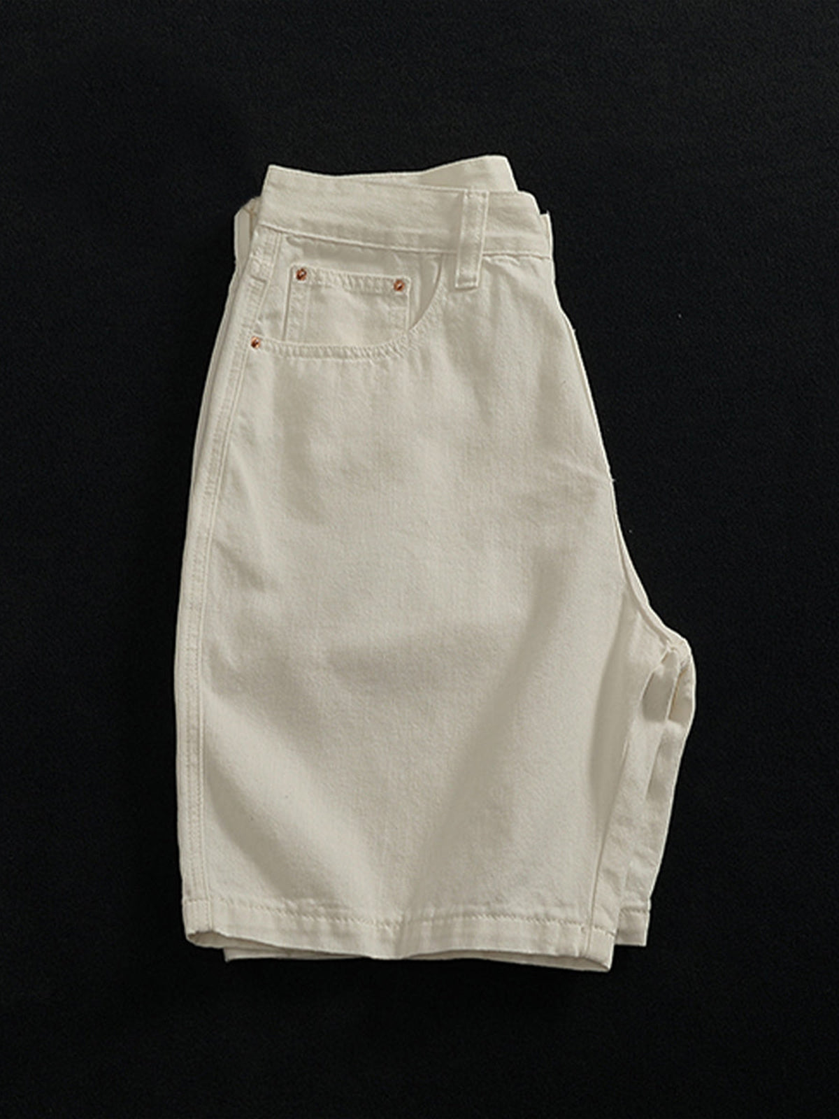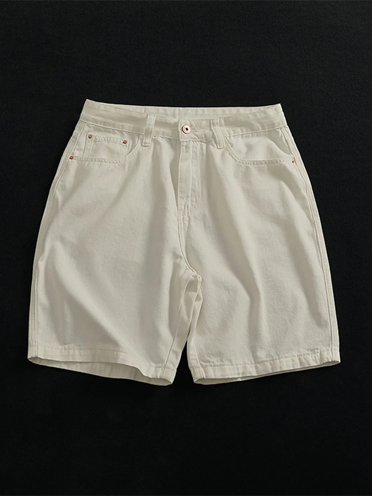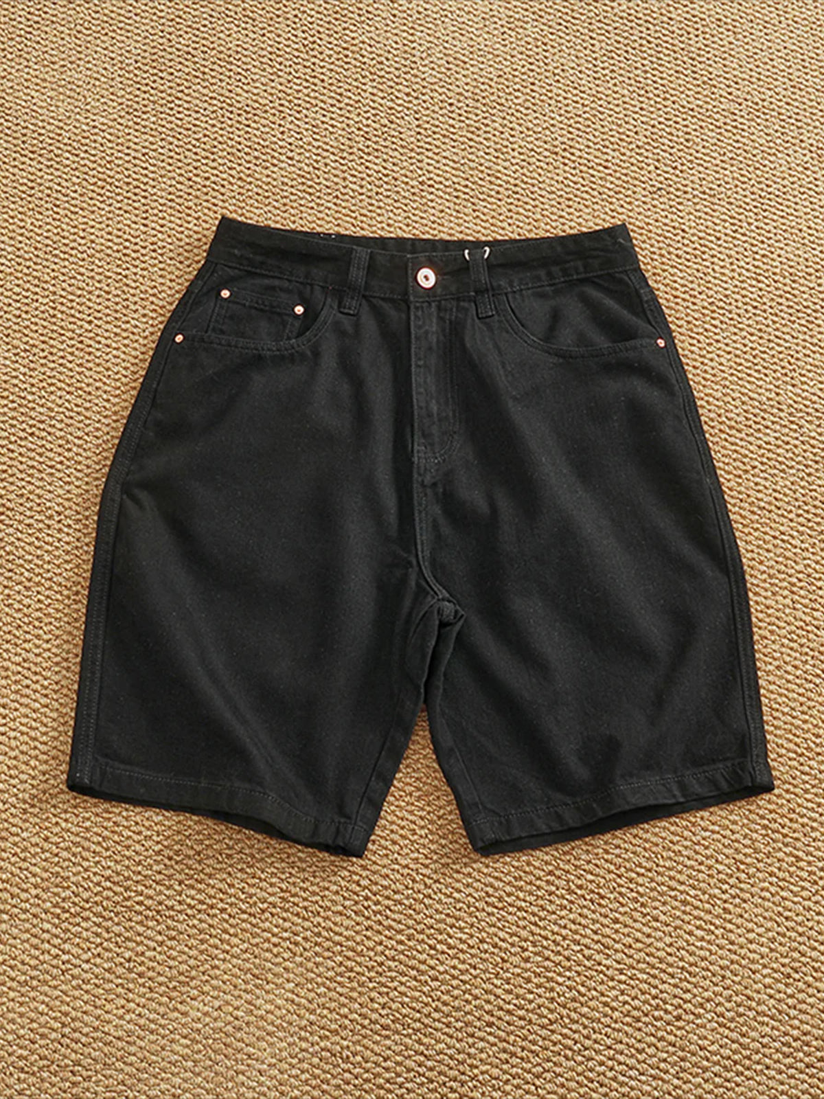 Minimal detailing makes it perfect for everyday wear. Cut in a slightly relaxed straight fit for a laid-back vibe, with a length that offers coverage without being overly short. Functional design includes two front slash pockets with a small coin pocket, and two back patch pockets. Belt loops allow styling with a belt, while the simple button-and-zip fly makes dressing easy. A leather brand patch on the waist adds a subtle accent.