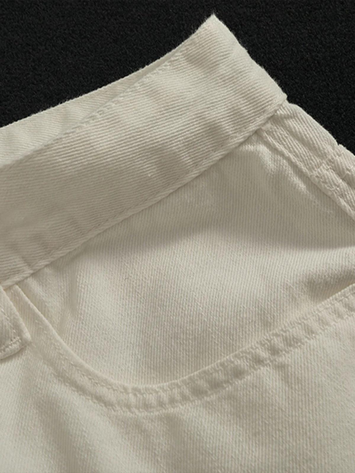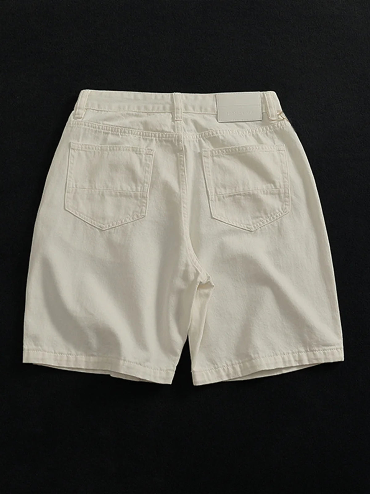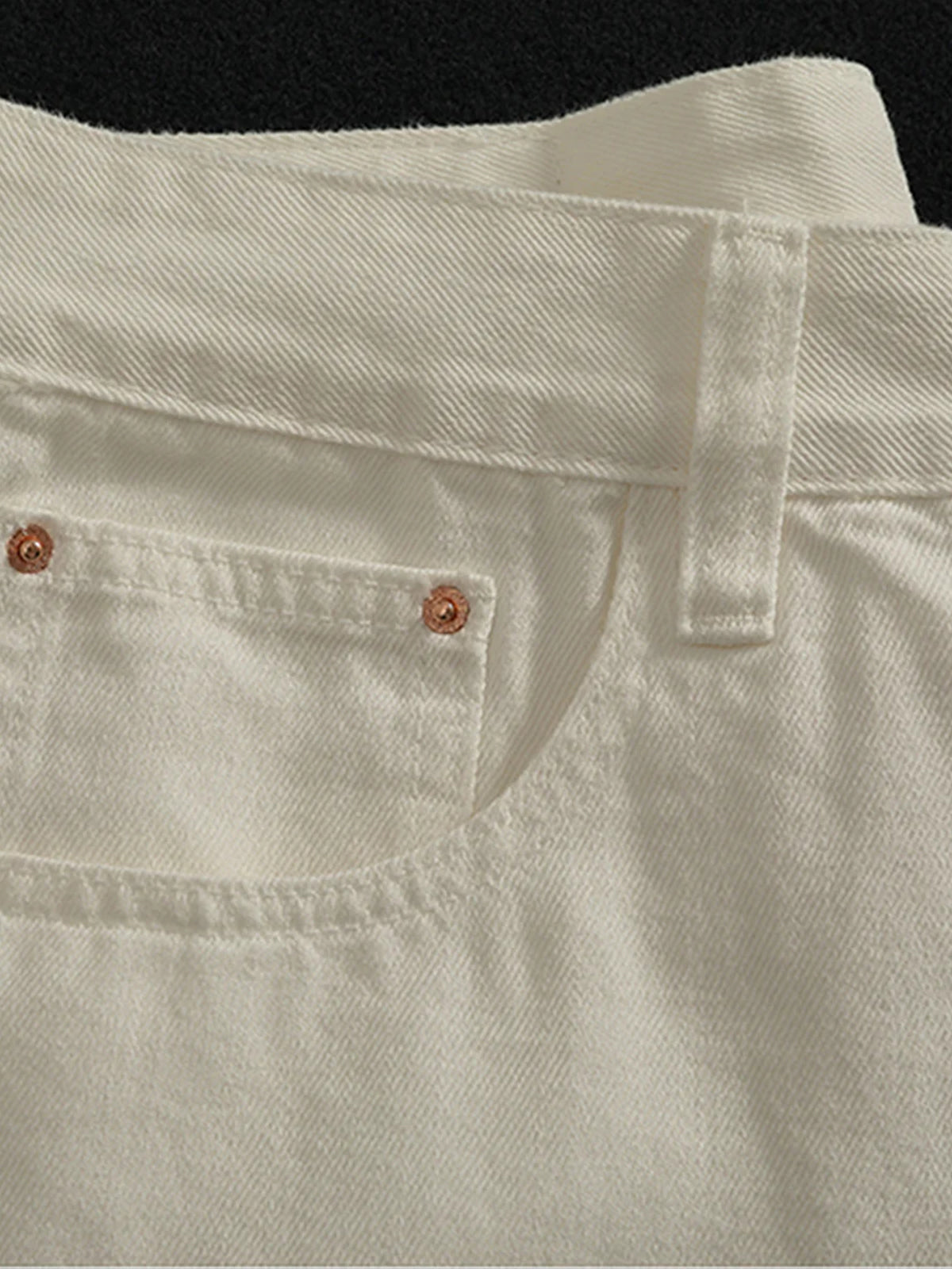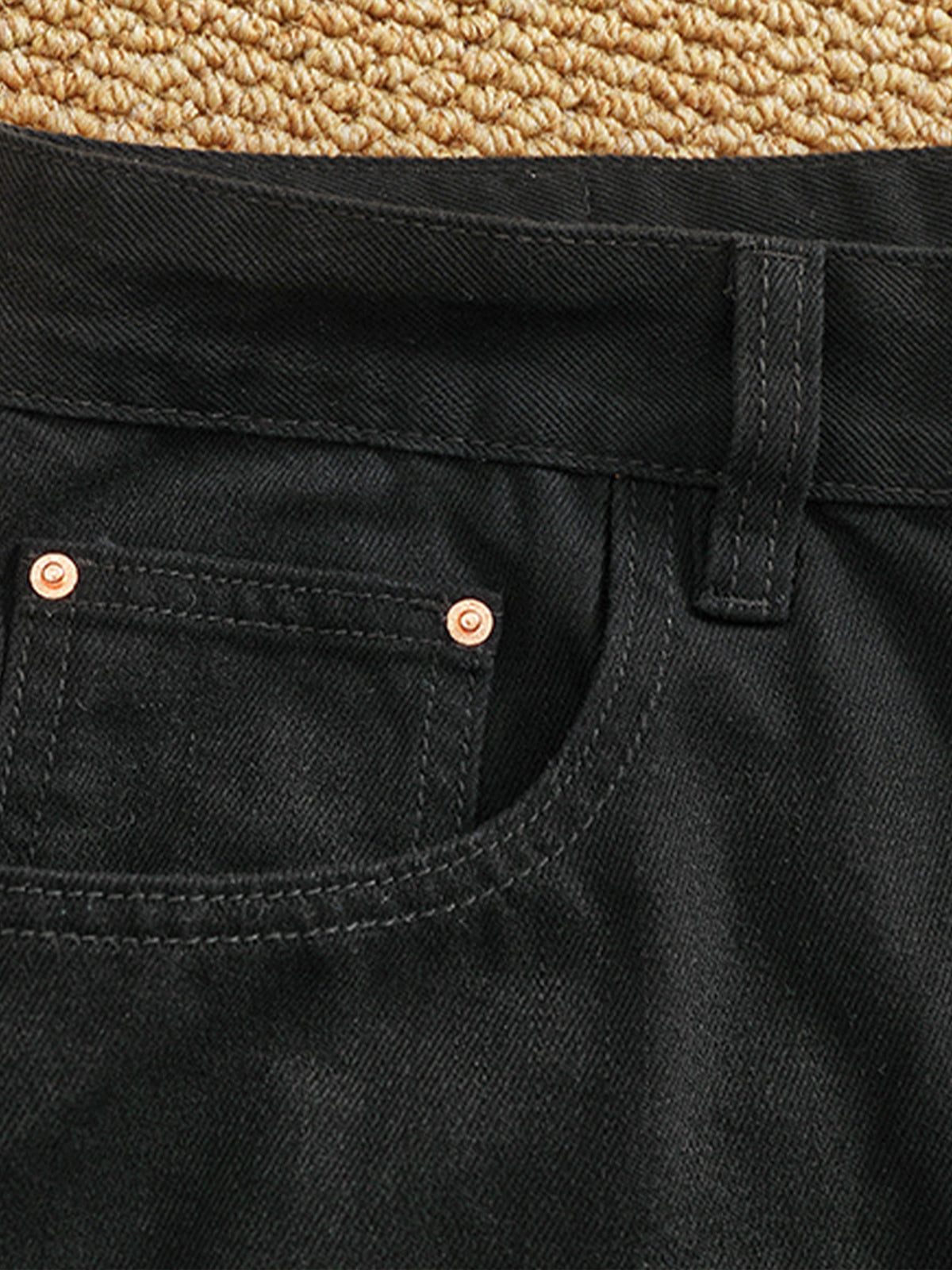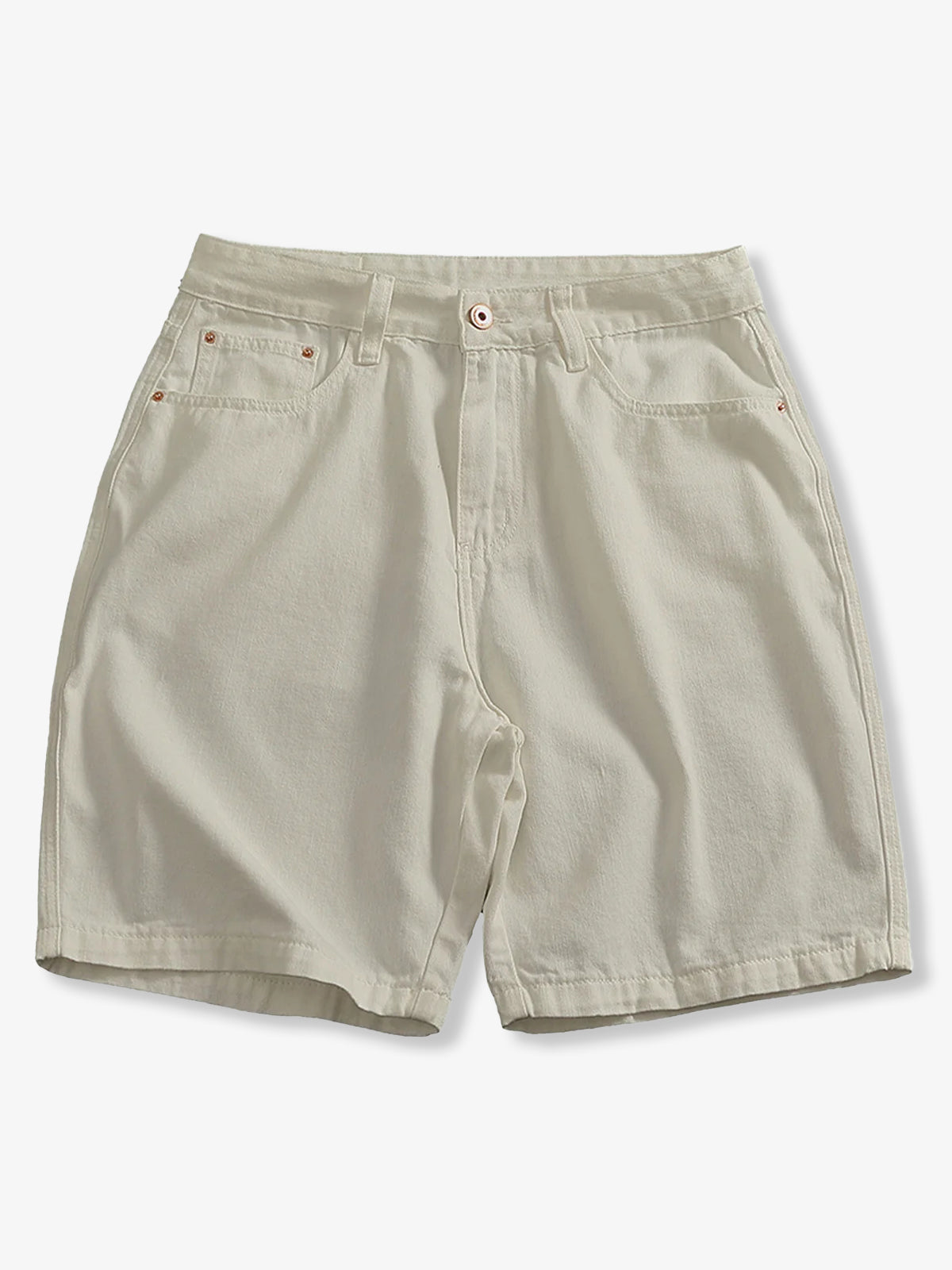 Minimal detailing makes it perfect for everyday wear. Cut in a slightly relaxed straight fit for a laid-back vibe, with a length that offers coverage without being overly short. Functional design includes two front slash pockets with a small coin pocket, and two back patch pockets. Belt loops allow styling with a belt, while the simple button-and-zip fly makes dressing easy. A leather brand patch on the waist adds a subtle accent.