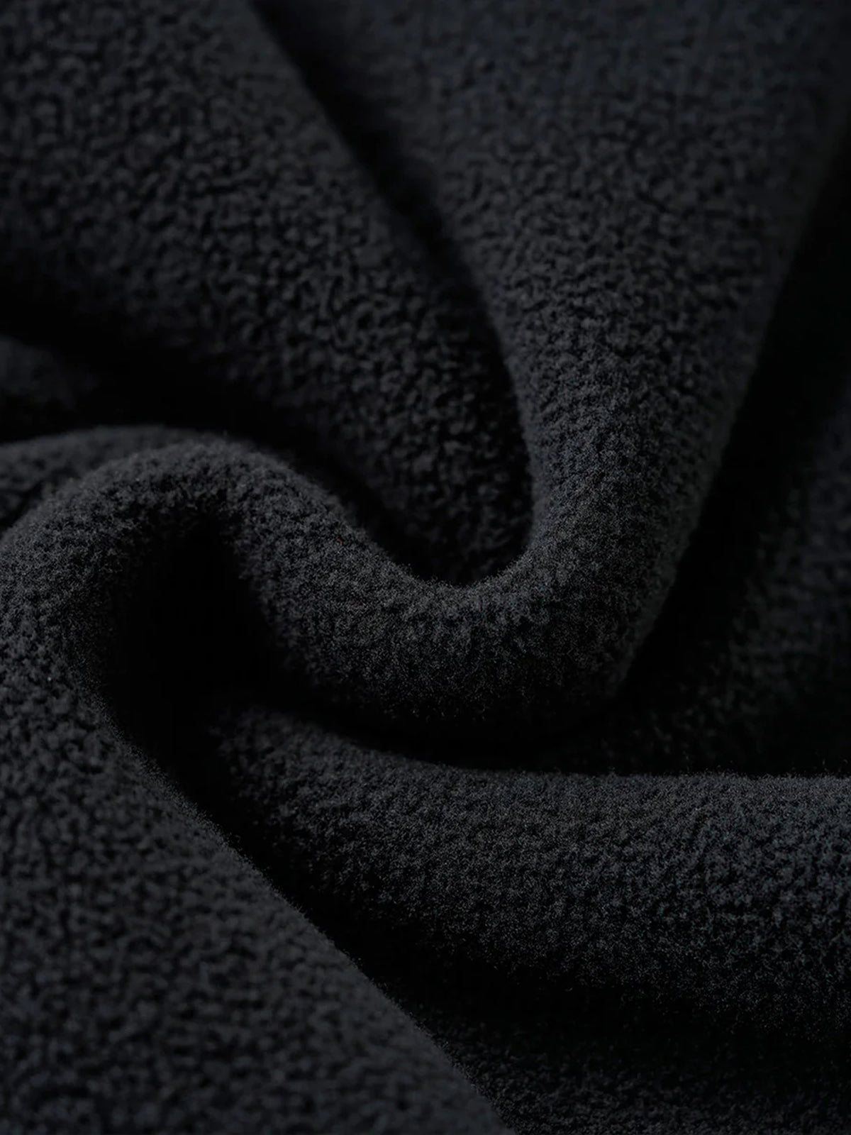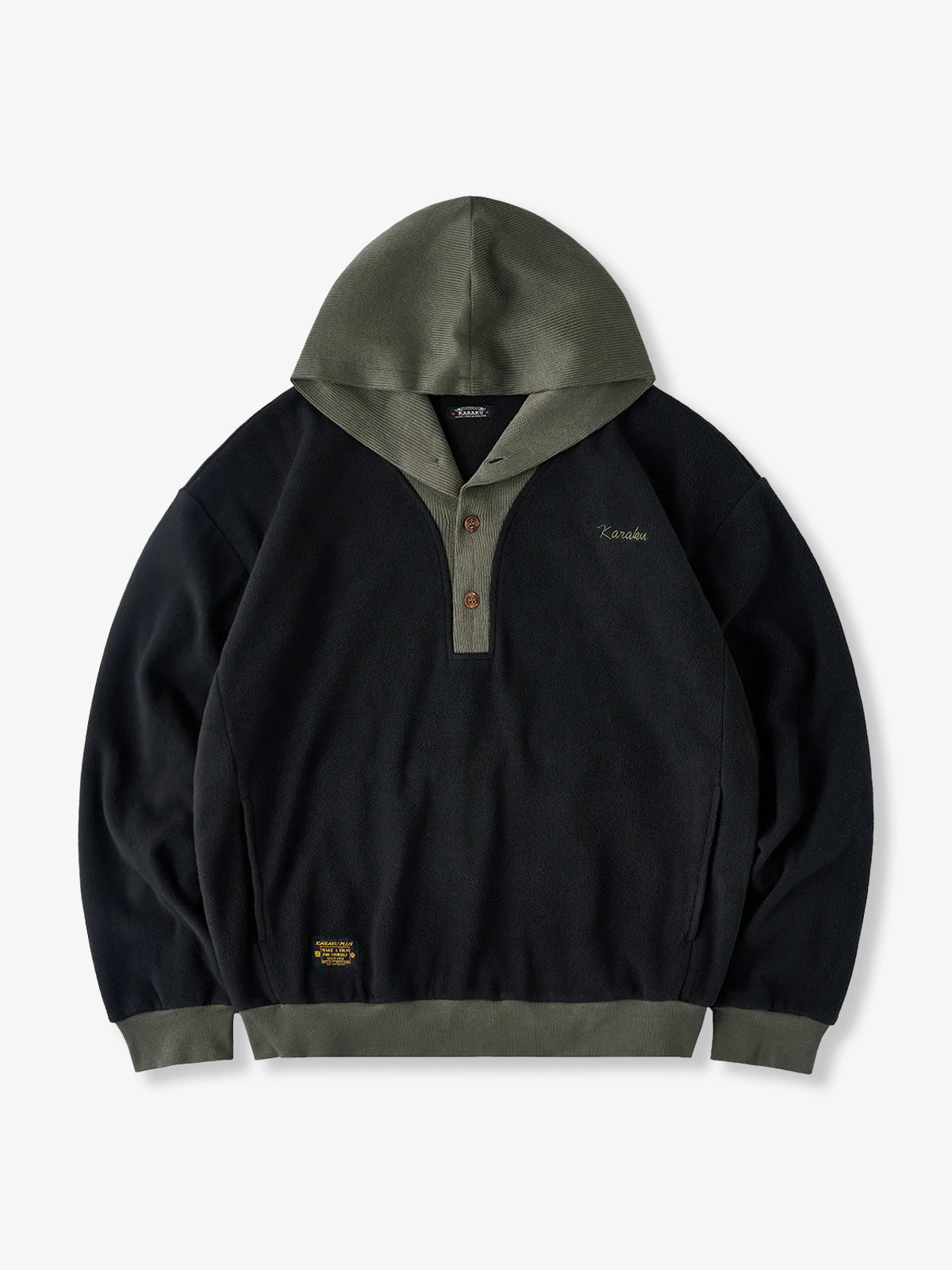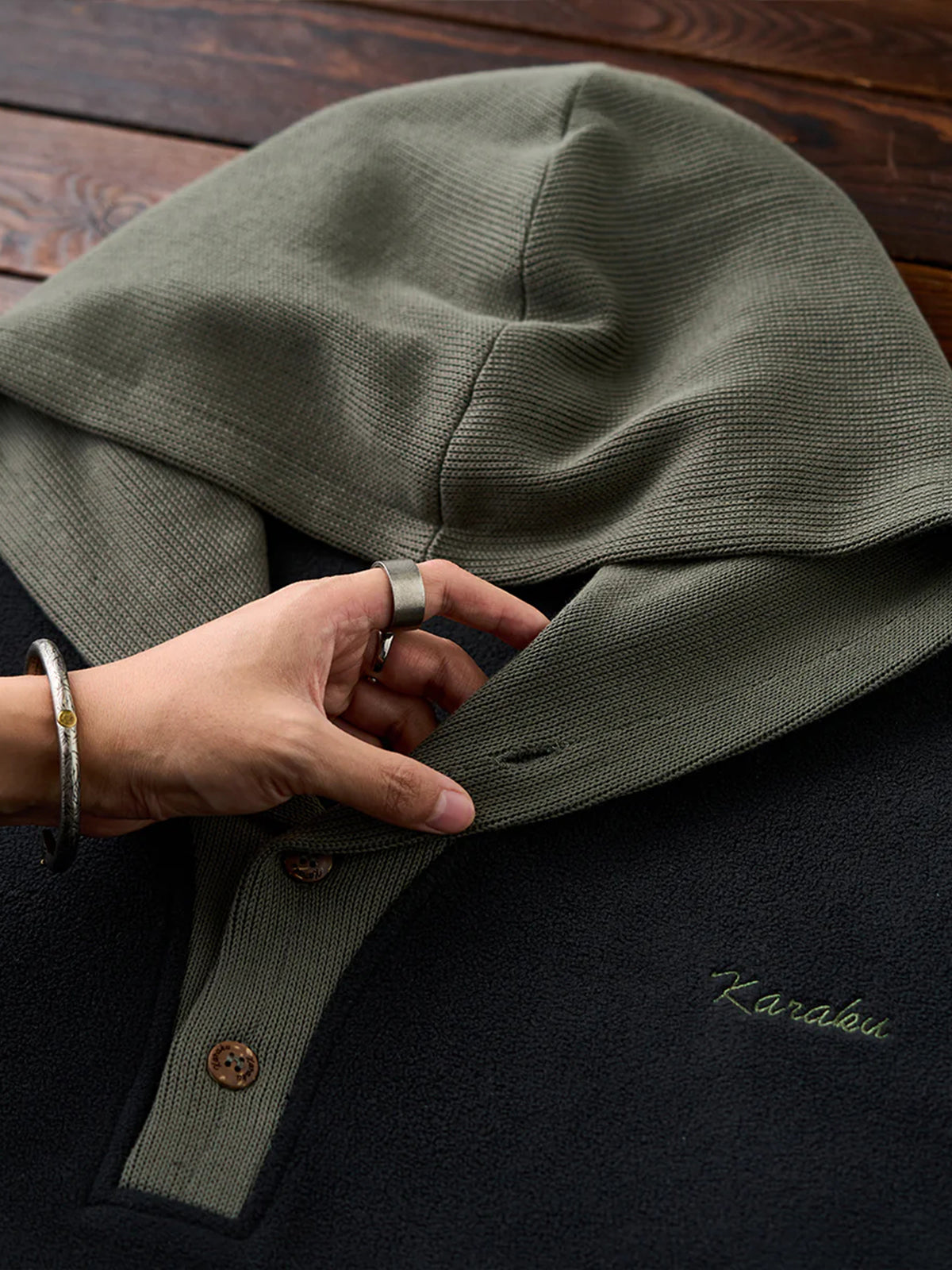 - Fabric Features: Fleece material is used for the body, offering high heat retention and comfort suitable for the autumn and winter seasons. Knit fabric is used around the hood and button area, emphasizing the contrast with the fleece.