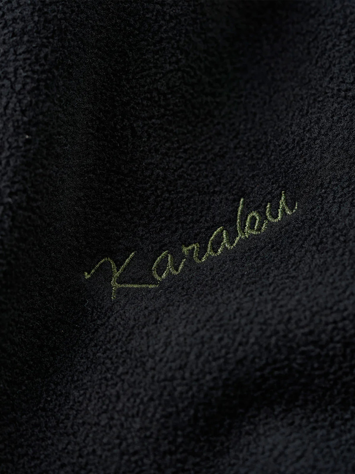 A modest "Karaku" logo is placed on the left chest with subtle embroidery, creating an elegant atmosphere while maintaining simplicity. As a minimal design, it serves as a point that does not disrupt the overall harmony. Wood-grain style buttons are used, giving a natural sense of warmth. The fine engravings also convey attention to detail.