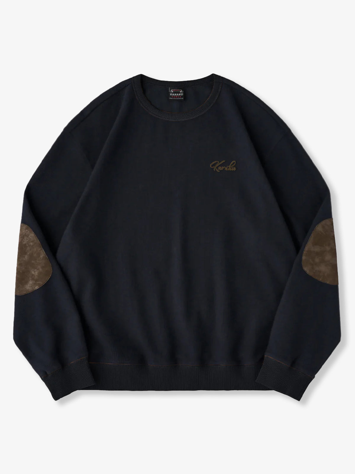 Around the chest, the brand logo "KaraKu" is embroidered, giving a simple yet premium feel. The brown suede-like patch on the elbows is not merely decorative but a functional detail that enhances durability.