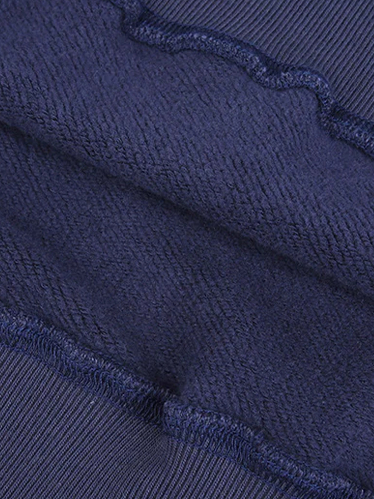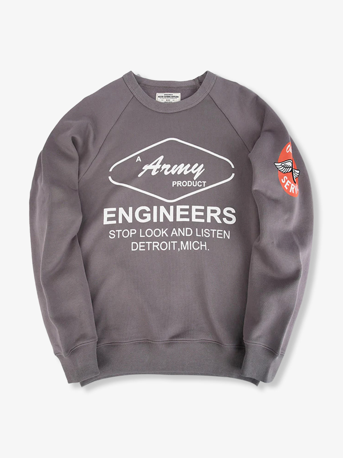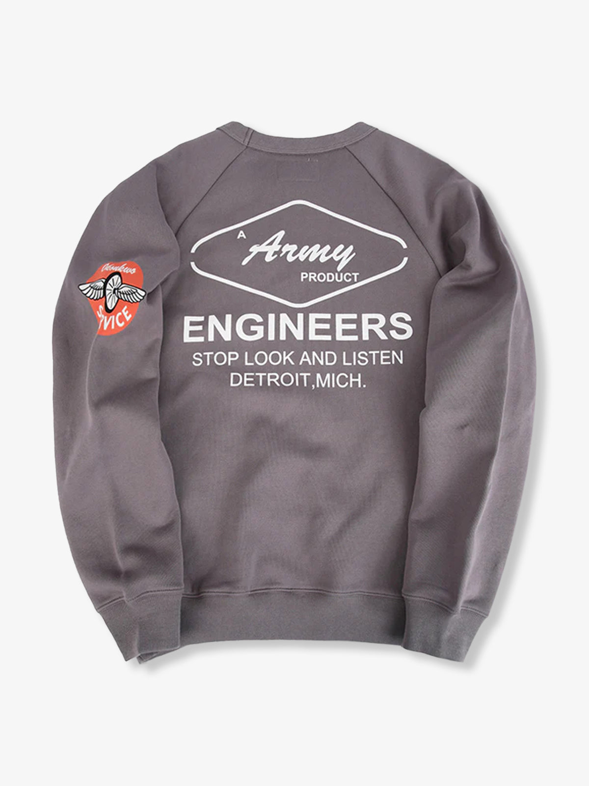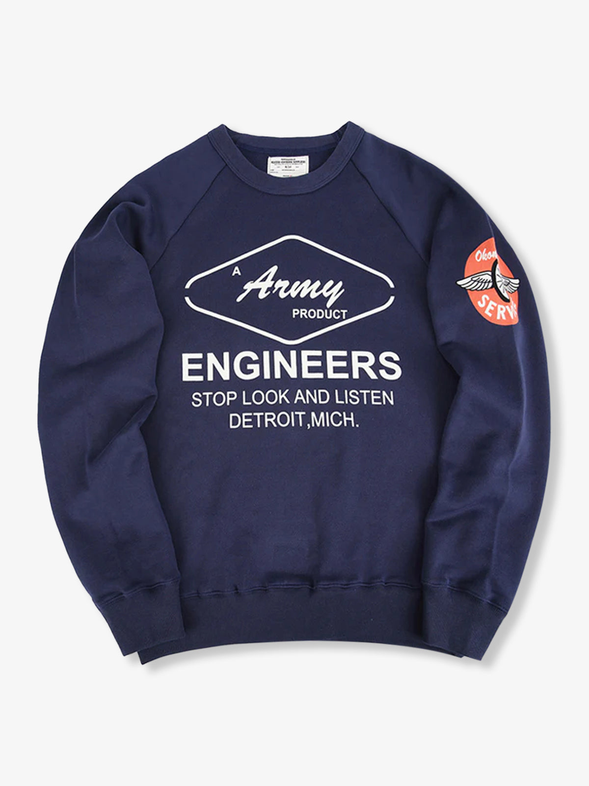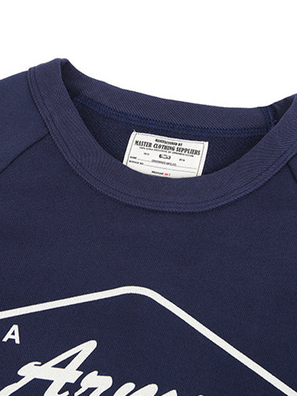 A soft and warm sweatshirt crafted from heavyweight 520g brushed cotton fleece. The smooth, flexible texture offers exceptional comfort and warmth, while the simple silhouette makes it easy to style for everyday wear. Features ribbed neckline, cuffs, and hem for a structured fit and sporty appeal. The dropped shoulder and raglan sleeve construction create a relaxed, easygoing look. A distinctive diagonal seam from neck to underarm enhances movement and adds visual interest. Military and biker-style graphics on the body give it a bold, masculine edge.