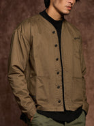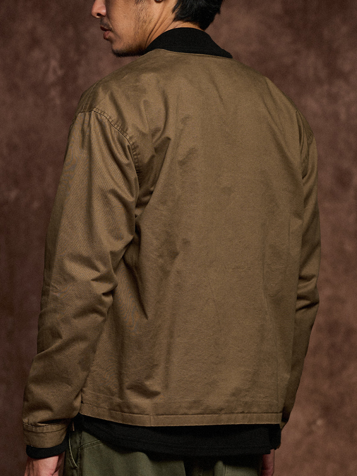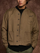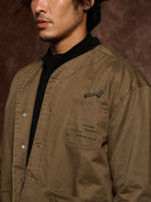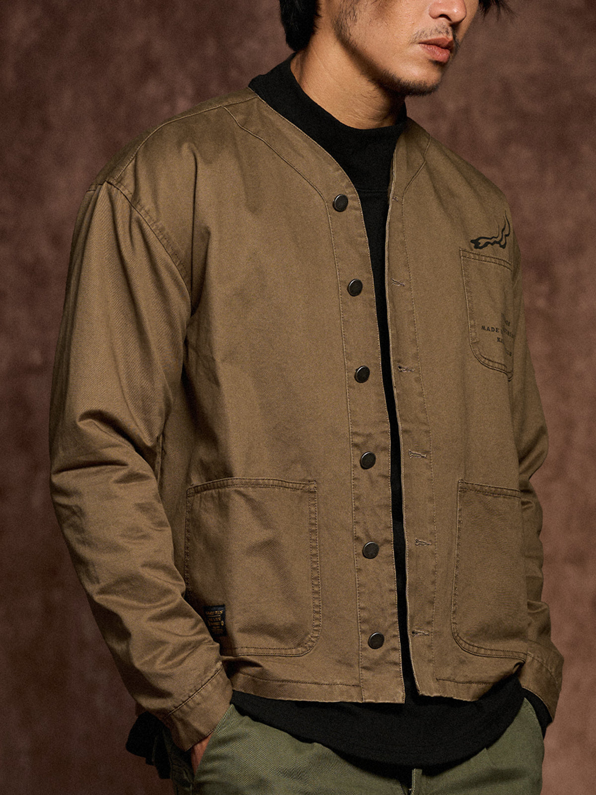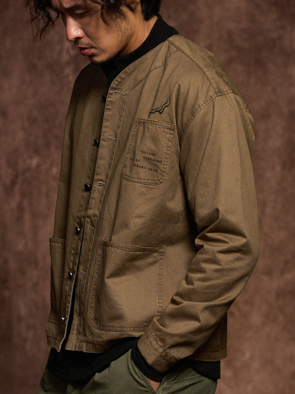 The no-collar design gives a modern and refined look, combining casual comfort with a stylish appearance. Large patch pockets on both sides offer high practicality. A flame motif print above the left chest pocket serves as a standout design feature, enhanced by the addition of the brand logo. The chest pocket is printed with the phrase: “VINTAGE CLOTHING MADE BY KARAKU PLUS”, expressing the brand's core concept.