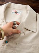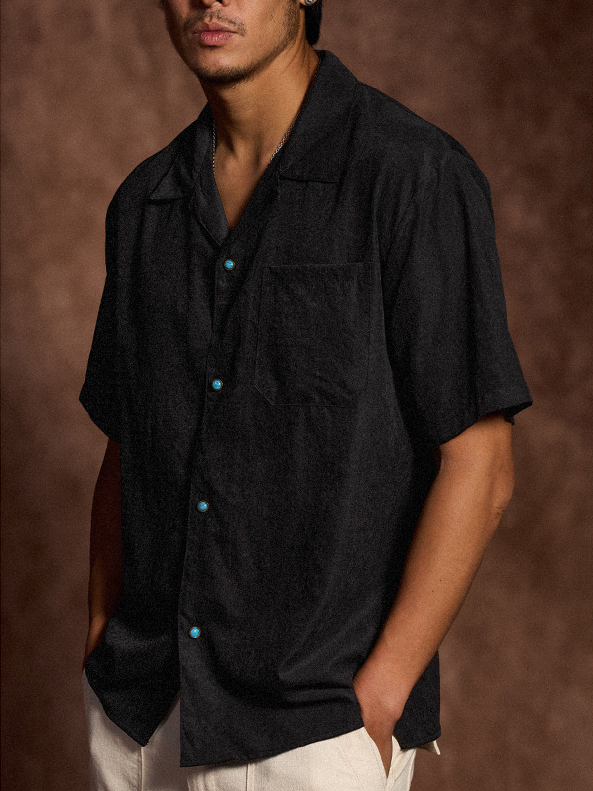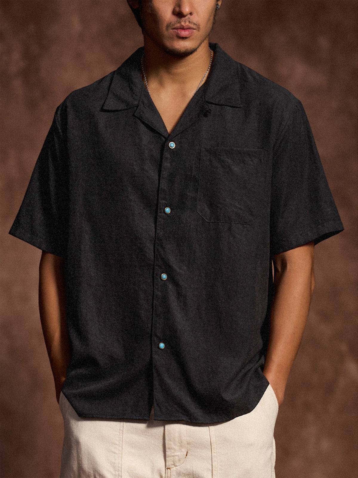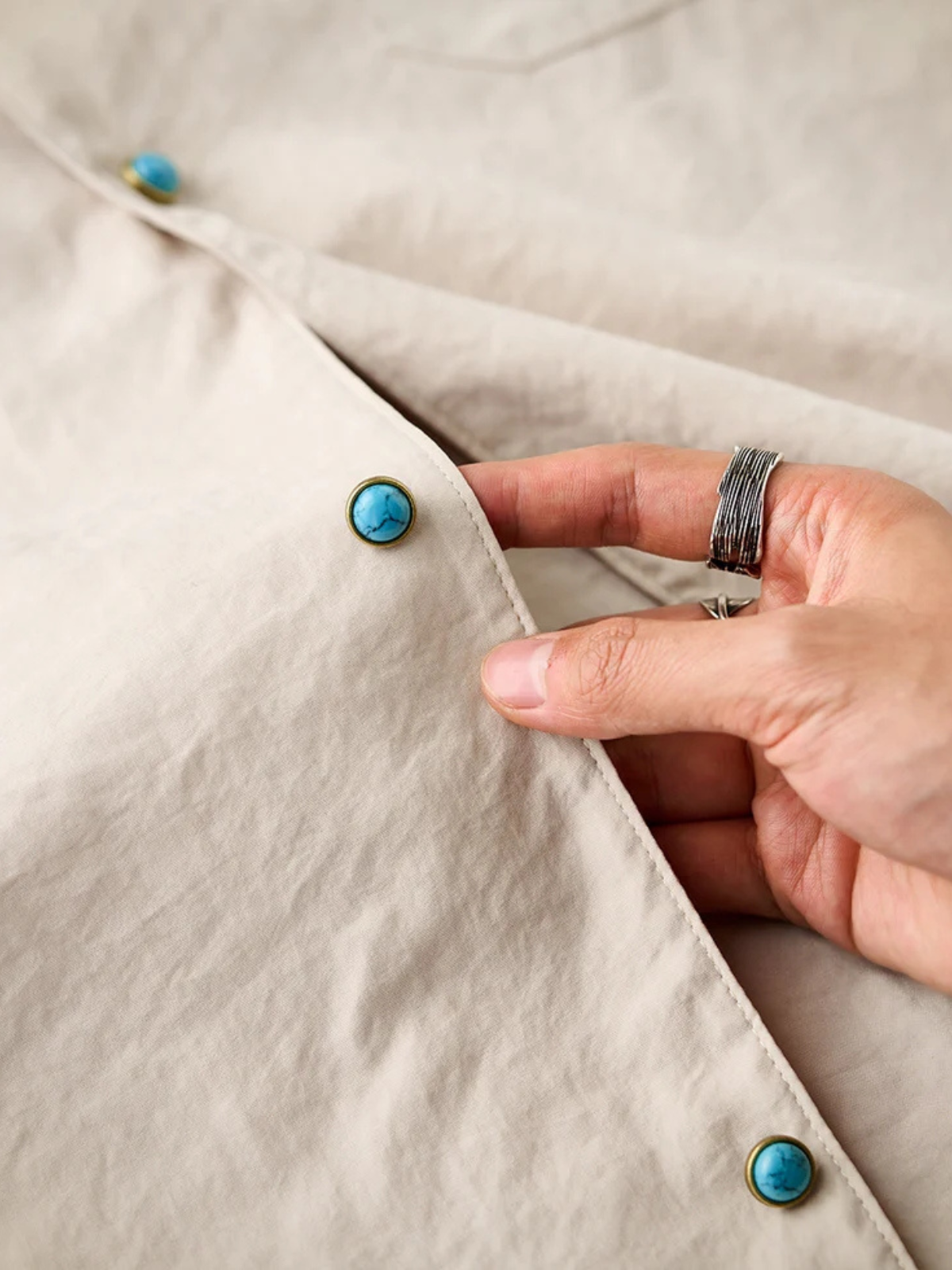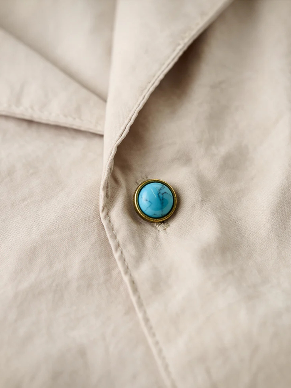 The stylish Cuban collar enhances the coordinated three-dimensional effect, and the cuffs are cut with space for easier movement. There is a pocket on the left chest, which is a point that is stuck on at the same time so as not to drop small items. The center of the metal button is inlaid with turquoise, and the button is surrounded by an antique gold and silver frame. And adds beautiful tailoring, a firm sewing method, and richness around the hem.