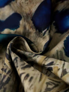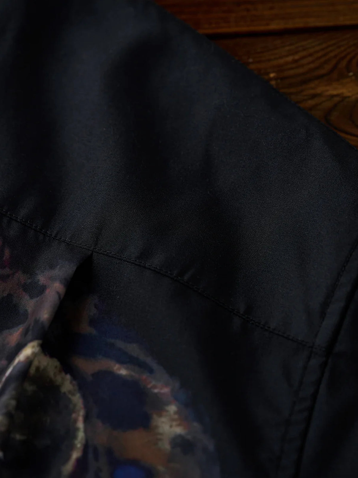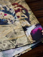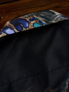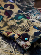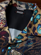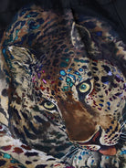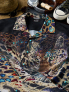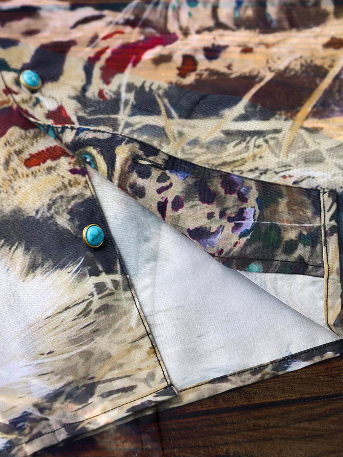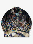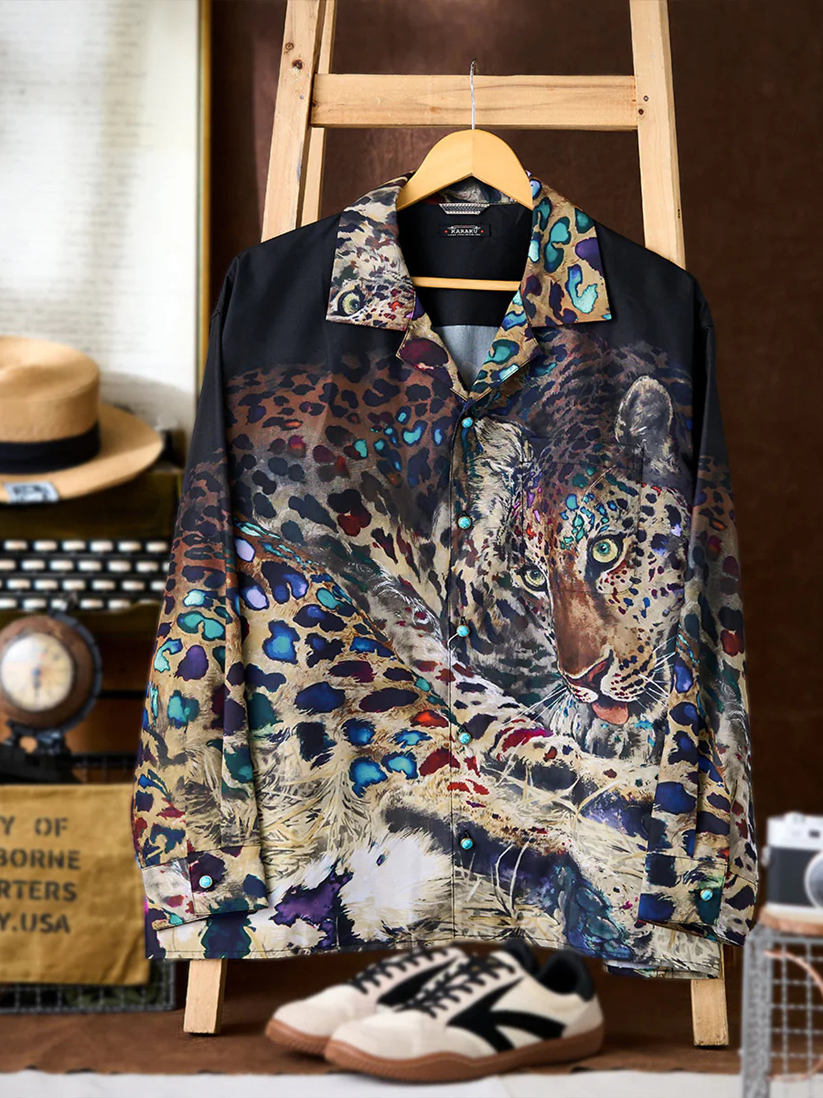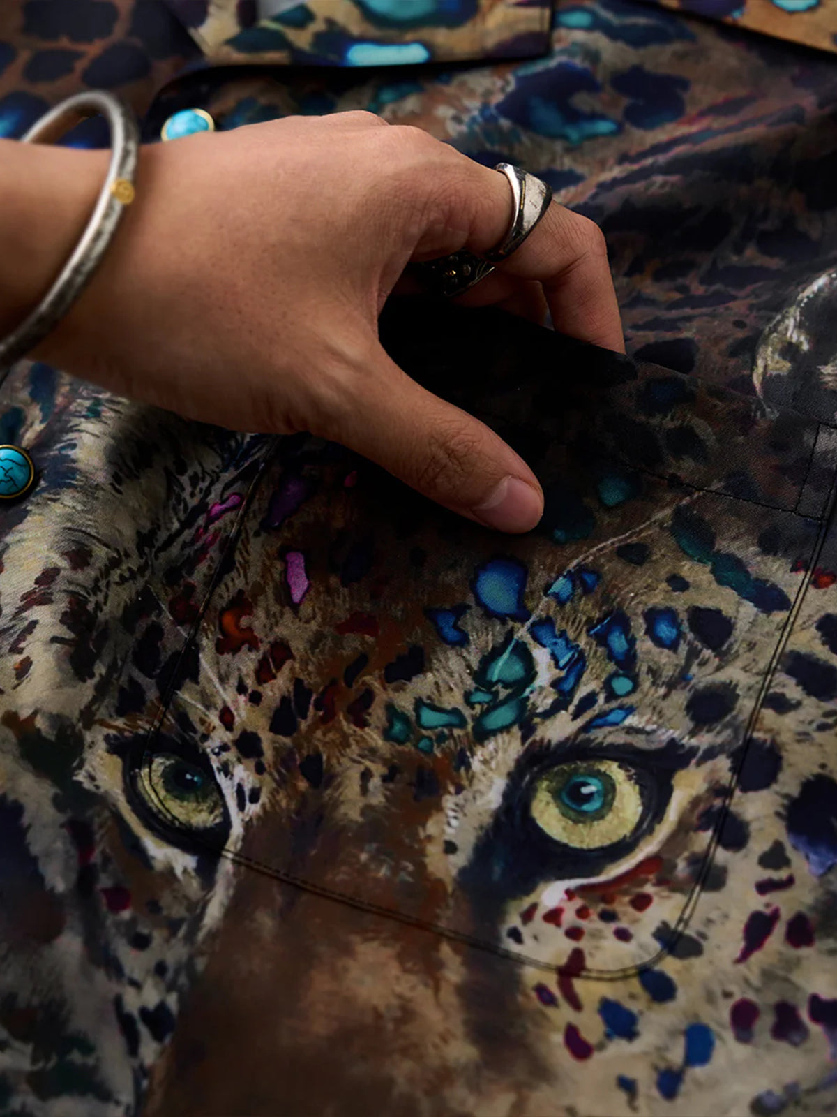 A leopard covered in colorful spots lies on the ground, quietly grooming itself. Though a wild beast, it exudes a tranquility as if it were in a dream. Attention is also given to the details: green turquoise-style buttons are placed on the placket, resonating with the artwork’s color palette to create a harmonious visual impression.