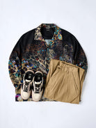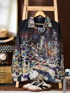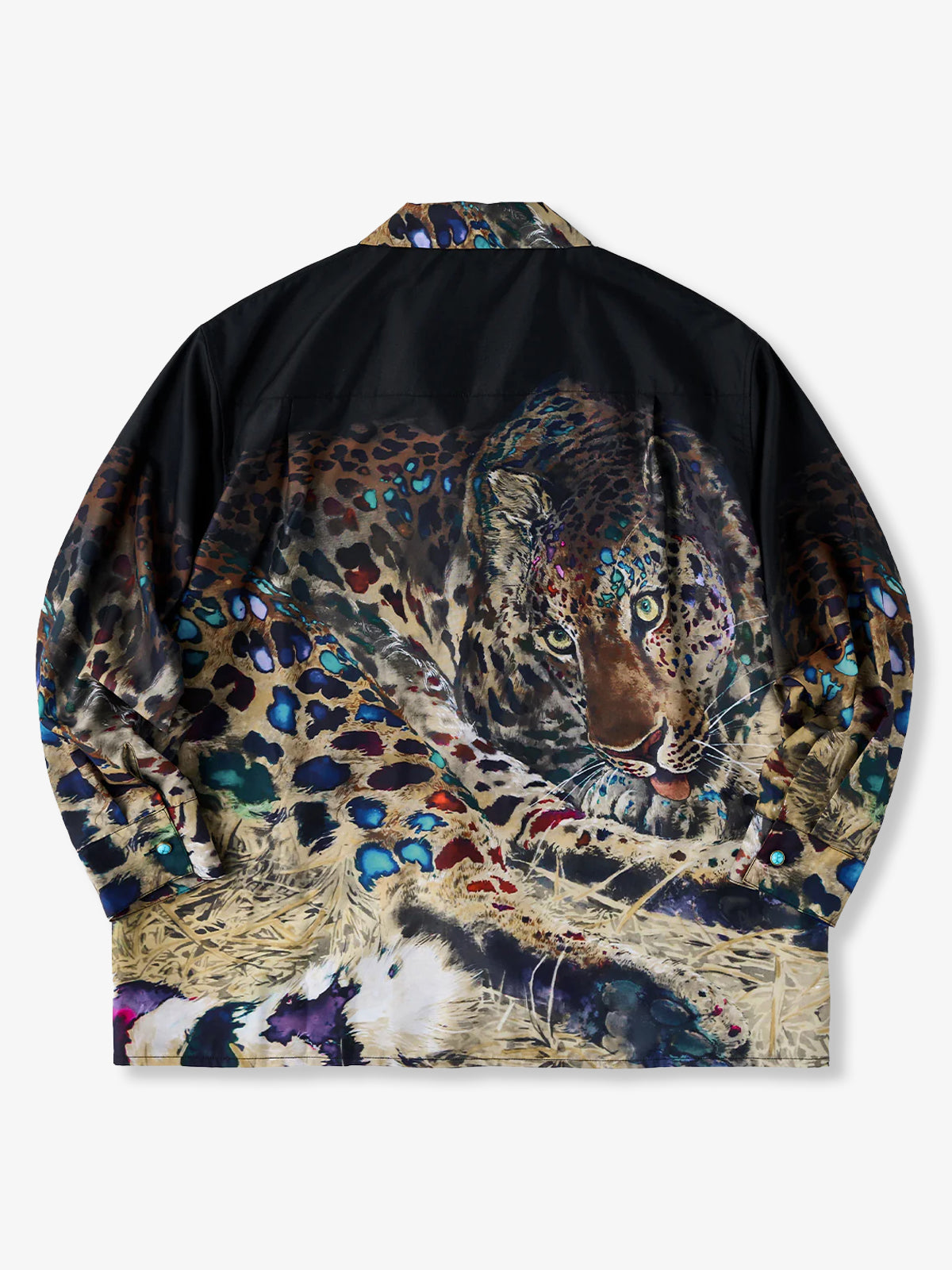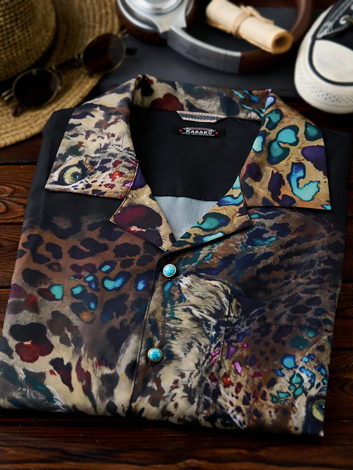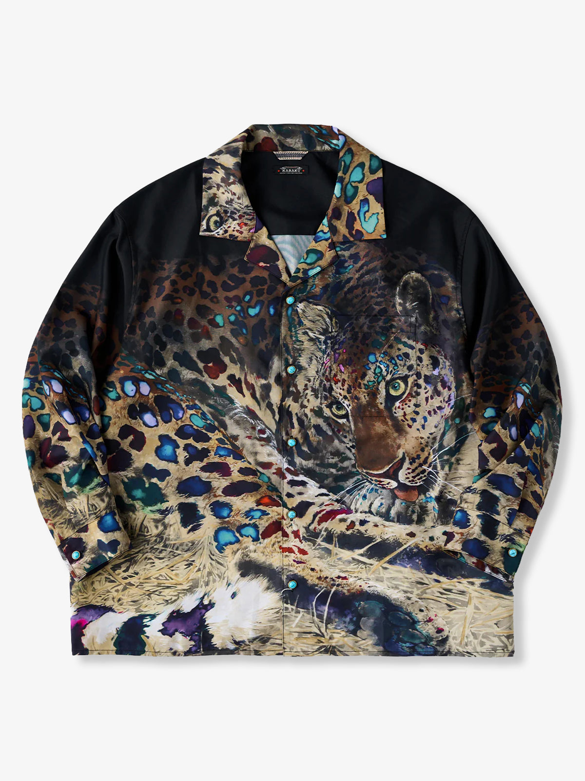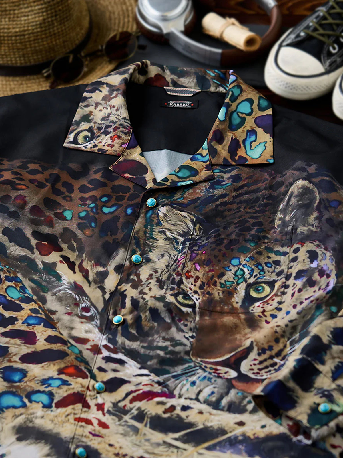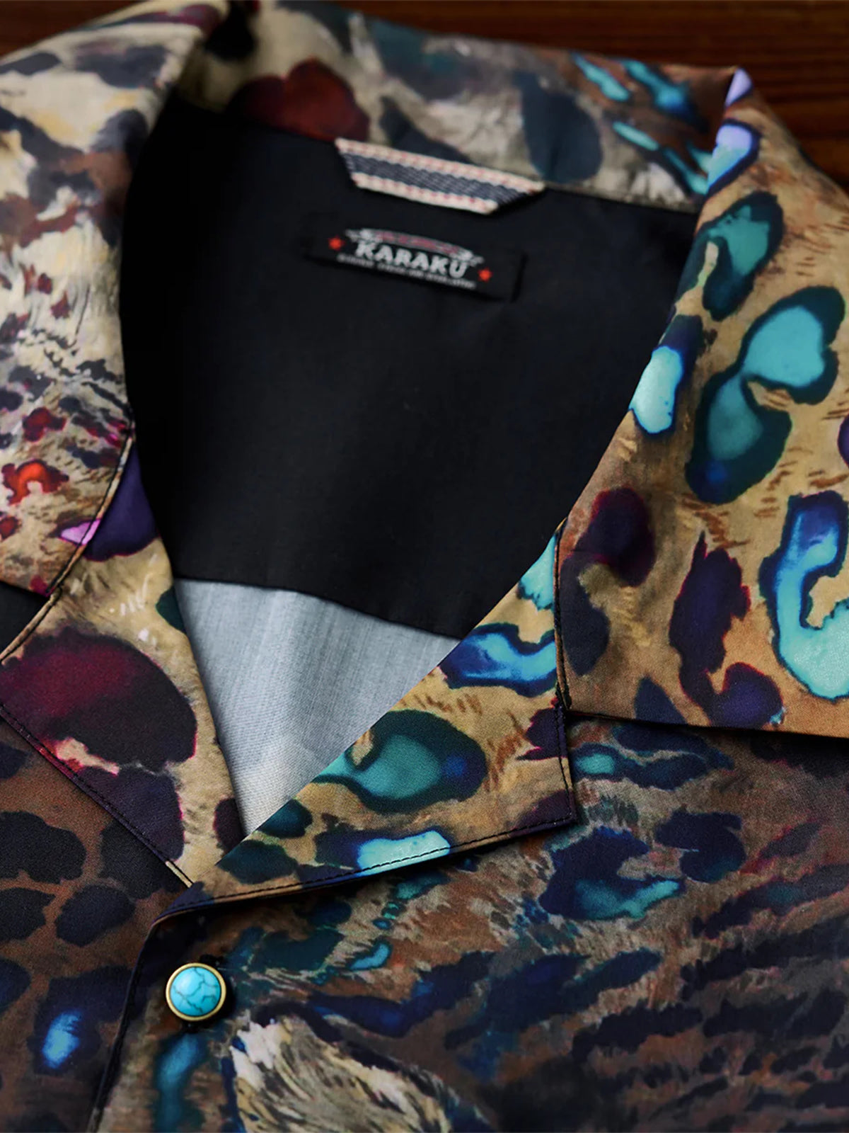 Karaku × Satoshi Kawamata "Dream Leopard" Turquoise-Button Open Collar Long Sleeve Shirt