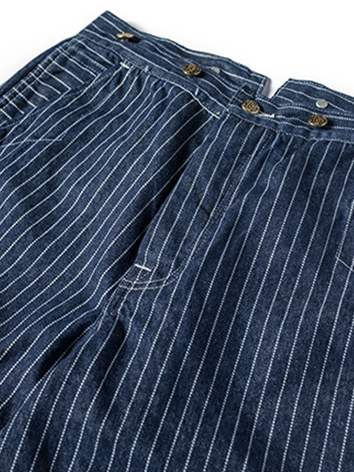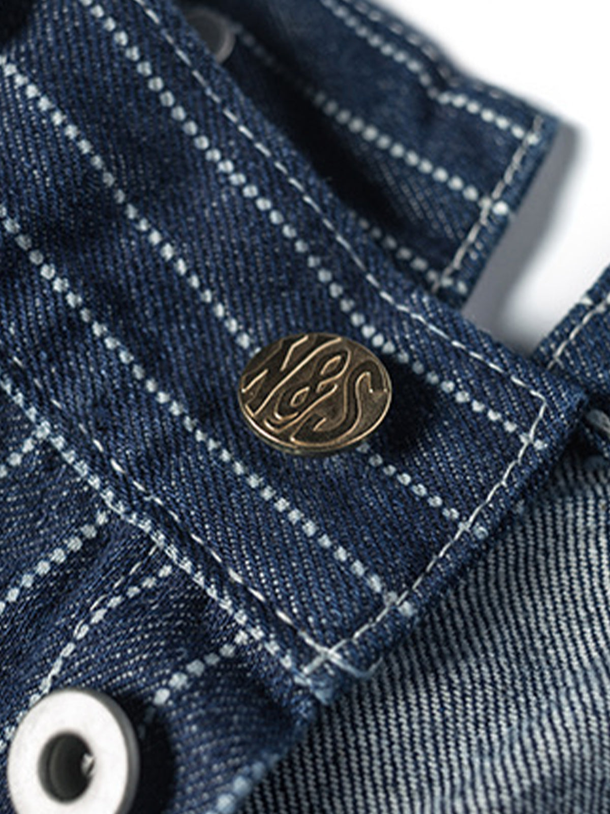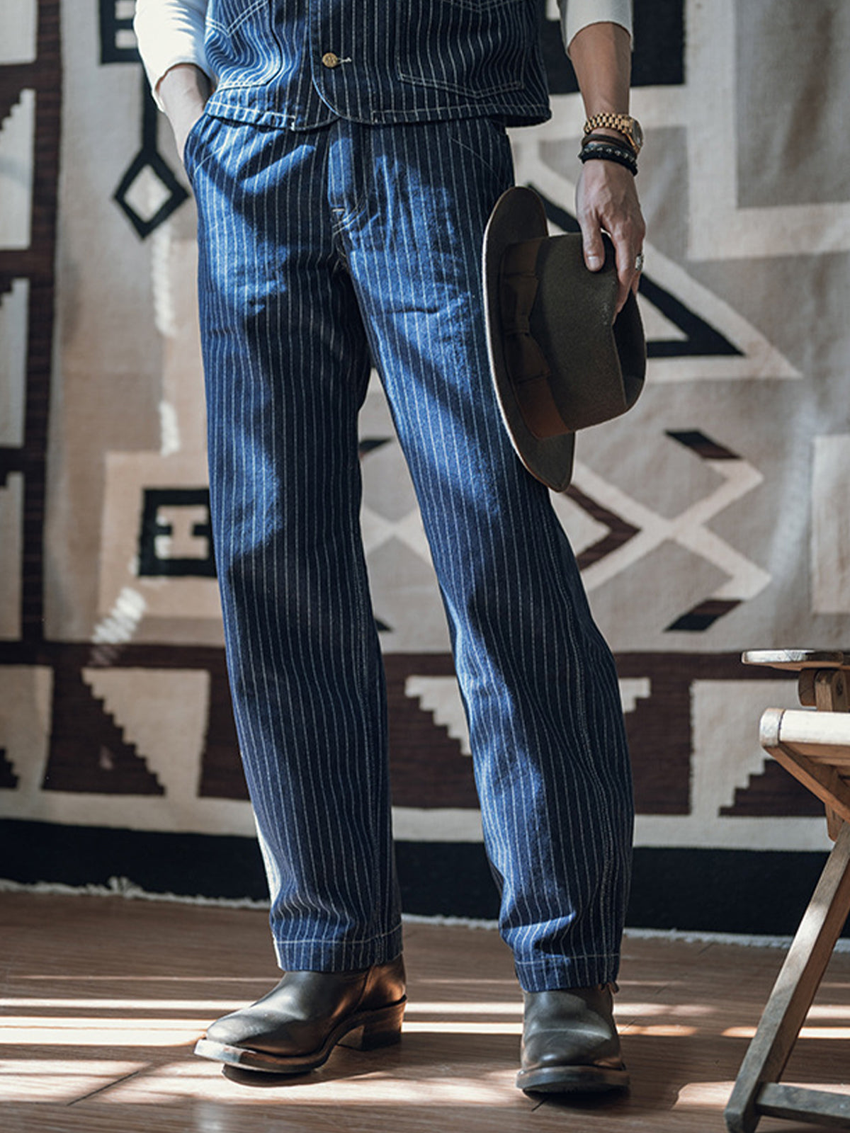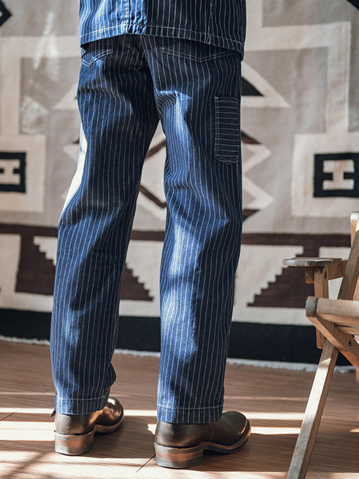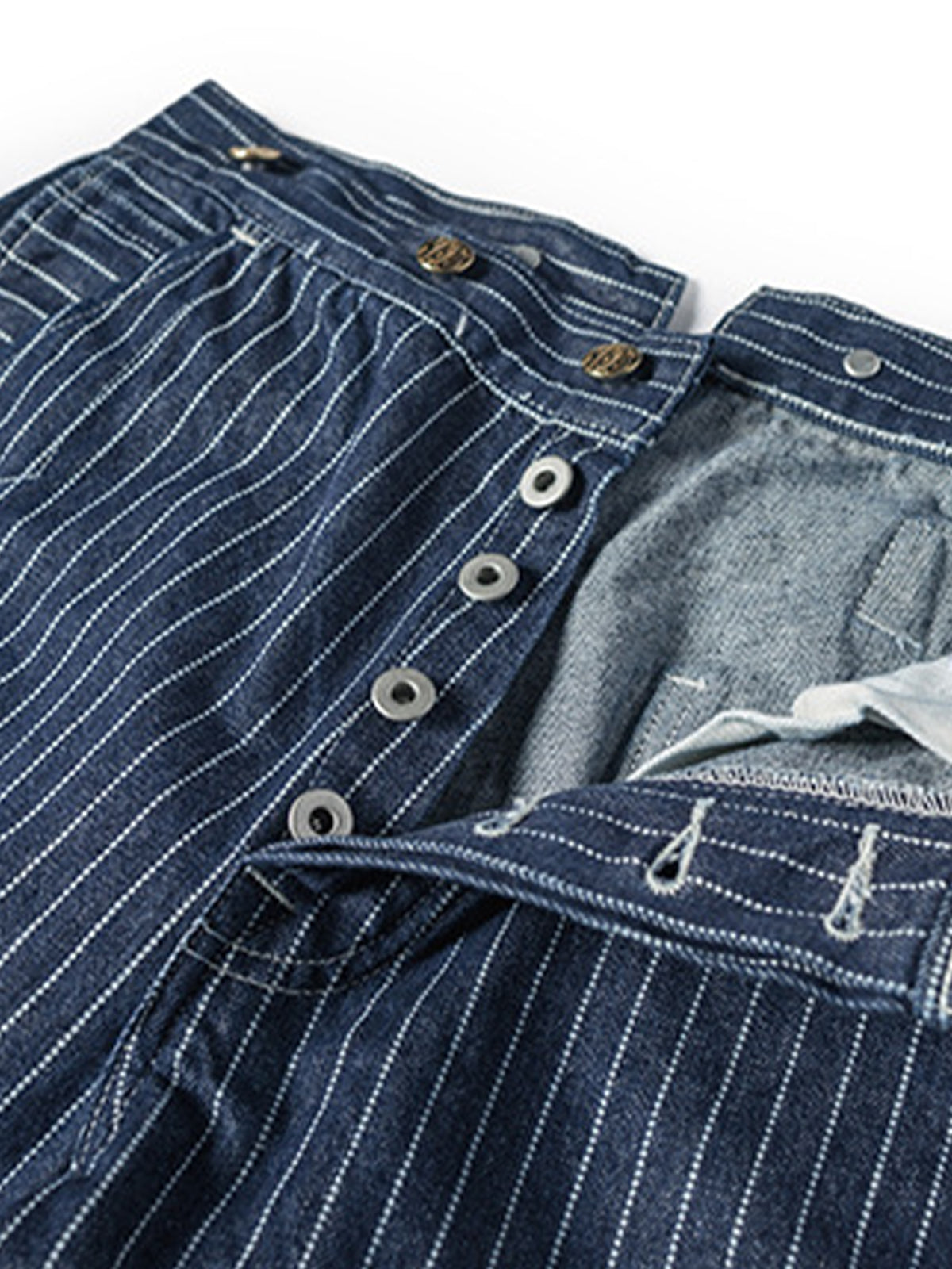 Inspired by 1920s American workwear, these Wabash Railroad Straight-Leg Jeans feature classic discharge dot stripes, a V-slit back waistband, and suspender-friendly belt loops. The mid-to-high rise and clean straight cut offer a vintage look that's easy to wear. Pair with a Henley tee or old-school shirt for an effortlessly retro style.