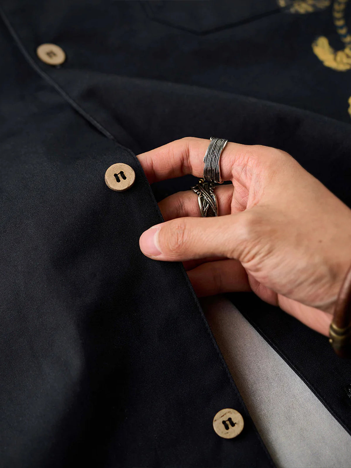 A print jointly produced by KaraKu and Ayako Ishiguro. The theme is Yokai, mysterious creatures, and imaginary creatures. A white tiger dressed in white flame stripes is lined up powerfully while biting the tail of the tiger in front of it. Ayako Ishiguro's original worldview of "white tiger biting tail" is expressed by an all-over print on the entire surface of the shirt. The vitality created by the overlapping eyes and undulating tail of the white tiger creates a somewhat mysterious mood. The open collar combines with the fabric to bring a sense of relaxation. You can enjoy the perfect balance of playfulness and adult escape, an original shirt unique to KARAKU.