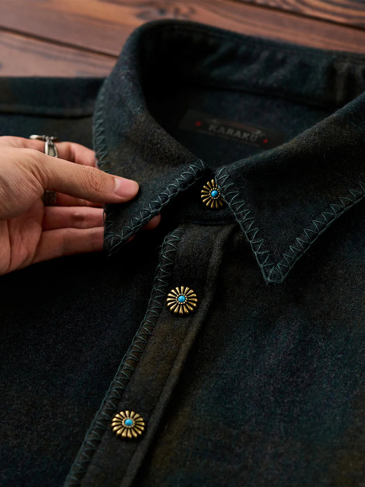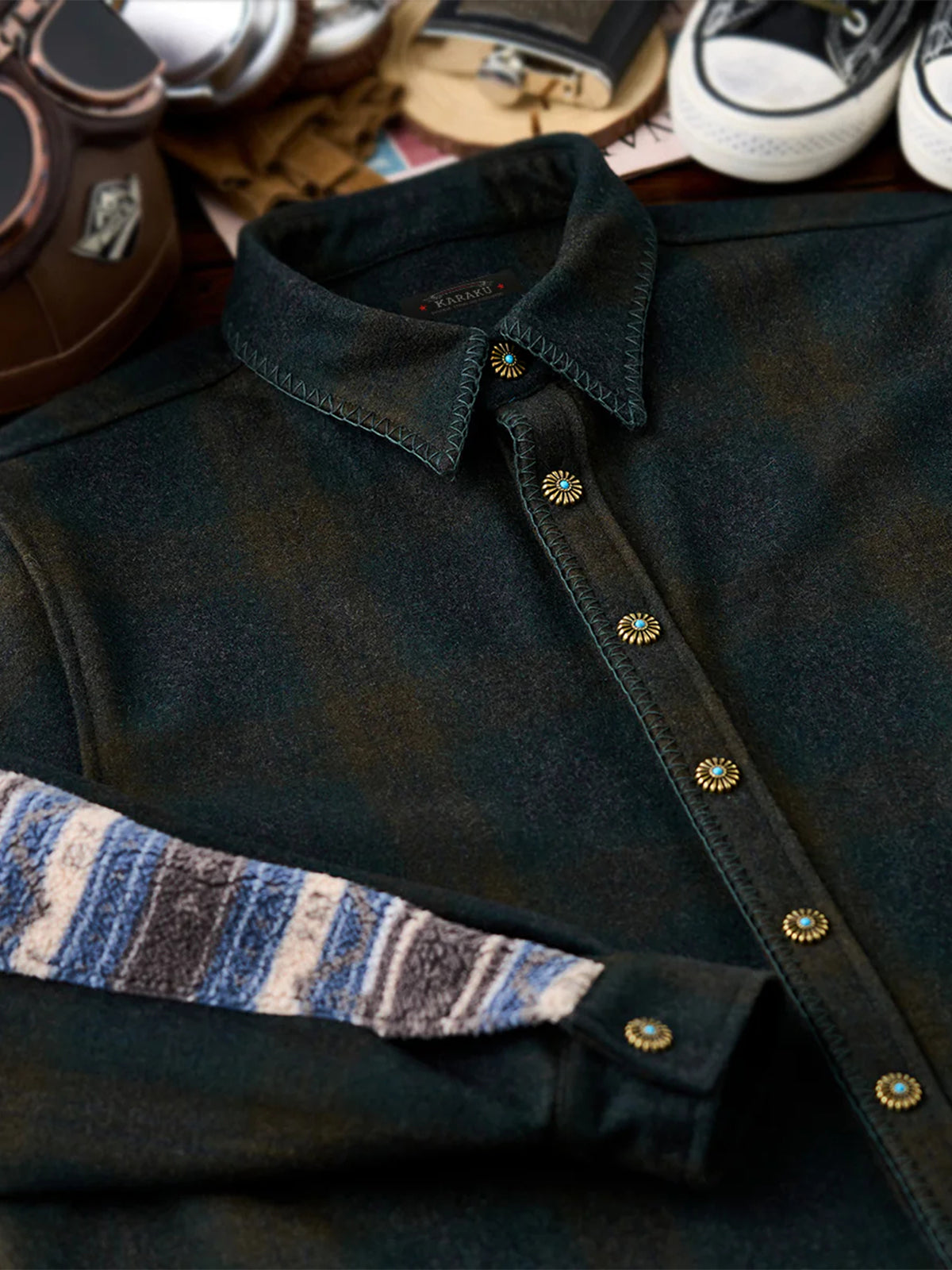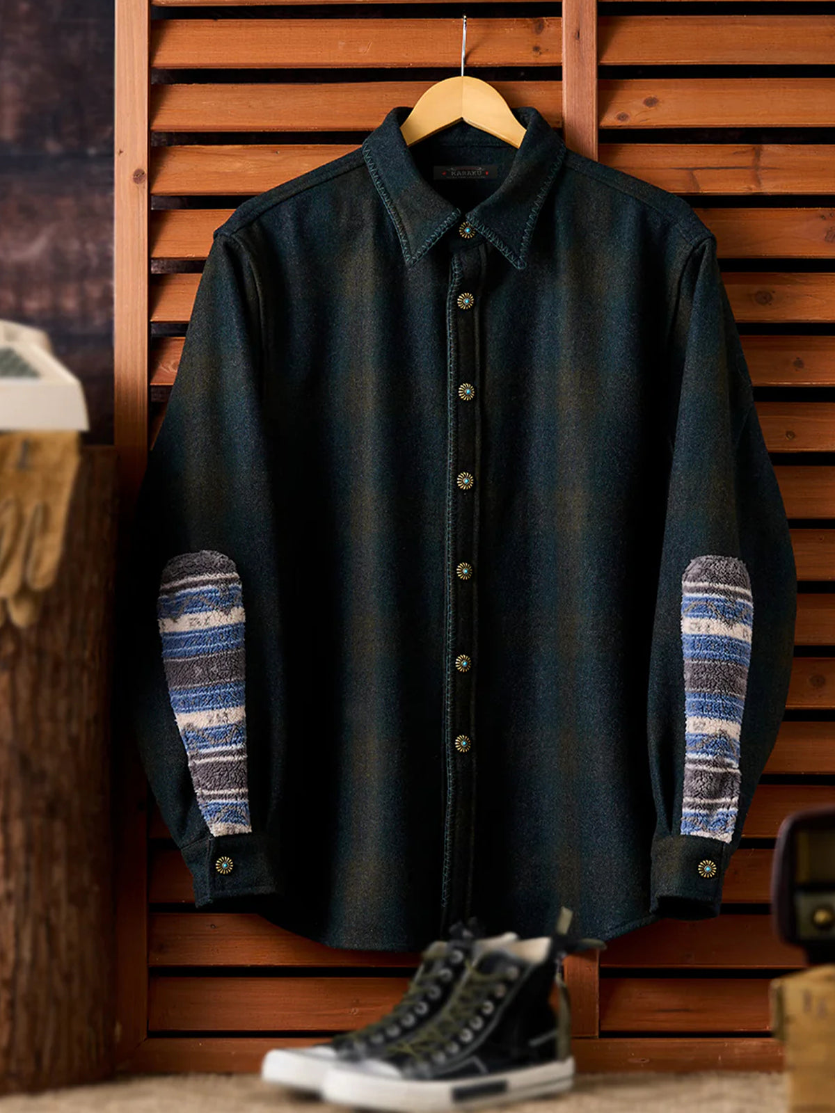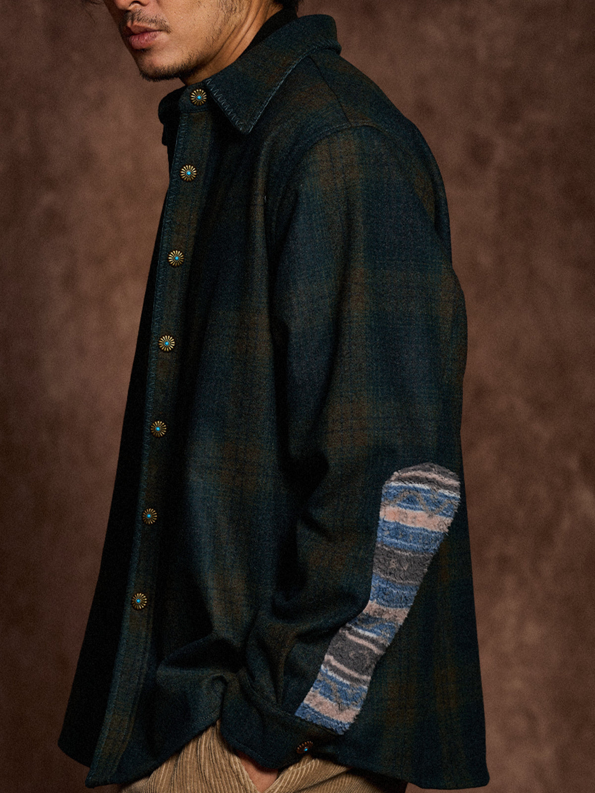 Concho Button Ethnic Pattern Patch Tweed Wool Plaid Shirt