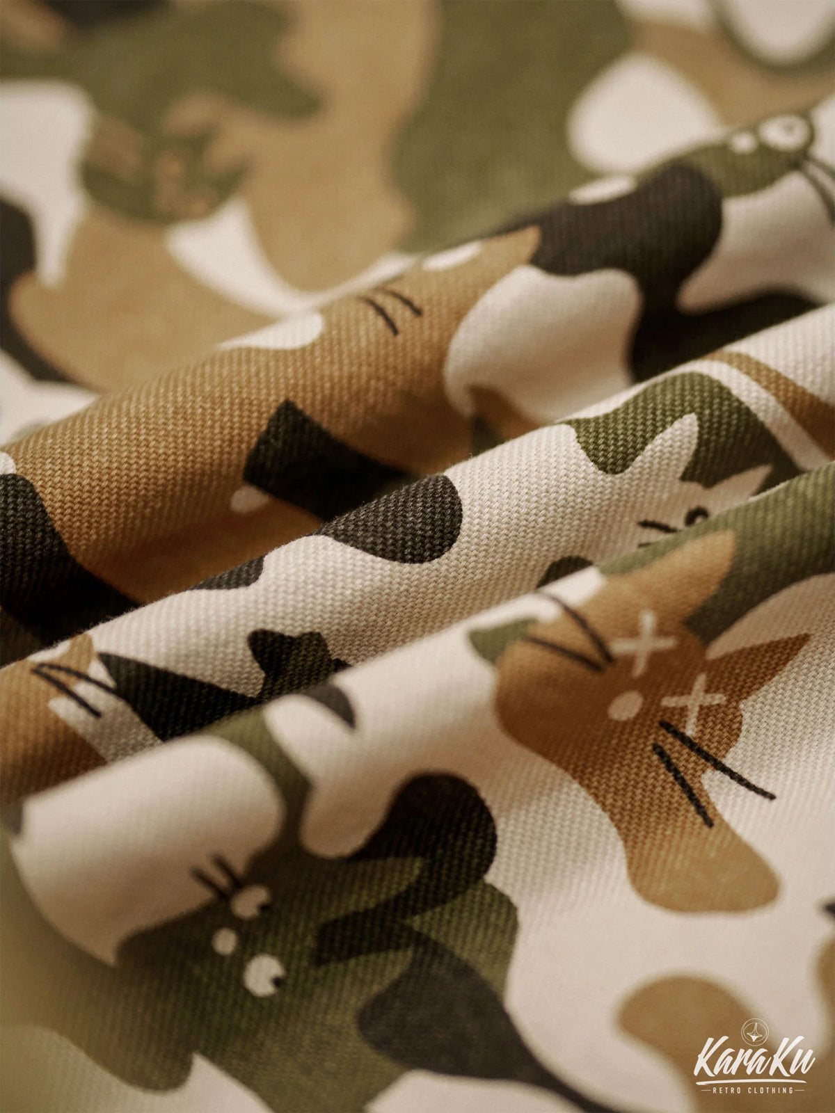 This military-style work shirt features a unique camouflage design, seamlessly integrating cat patterns to mimic their natural fur tones, including browns, greens, and blacks. Made from breathable cotton, it offers excellent moisture-wicking and quick-drying properties, ensuring comfort. Perfect for town outings or outdoor adventures, this stylish shirt adds a trendy touch to any wardrobe.