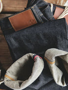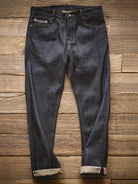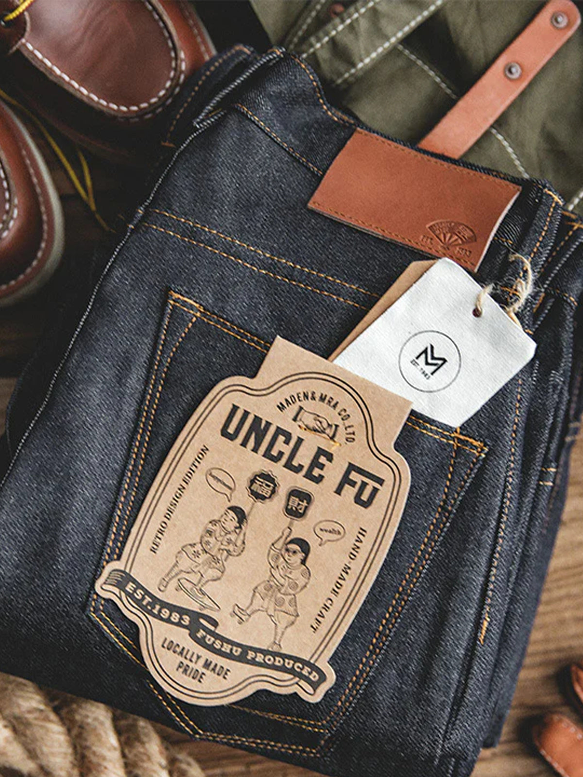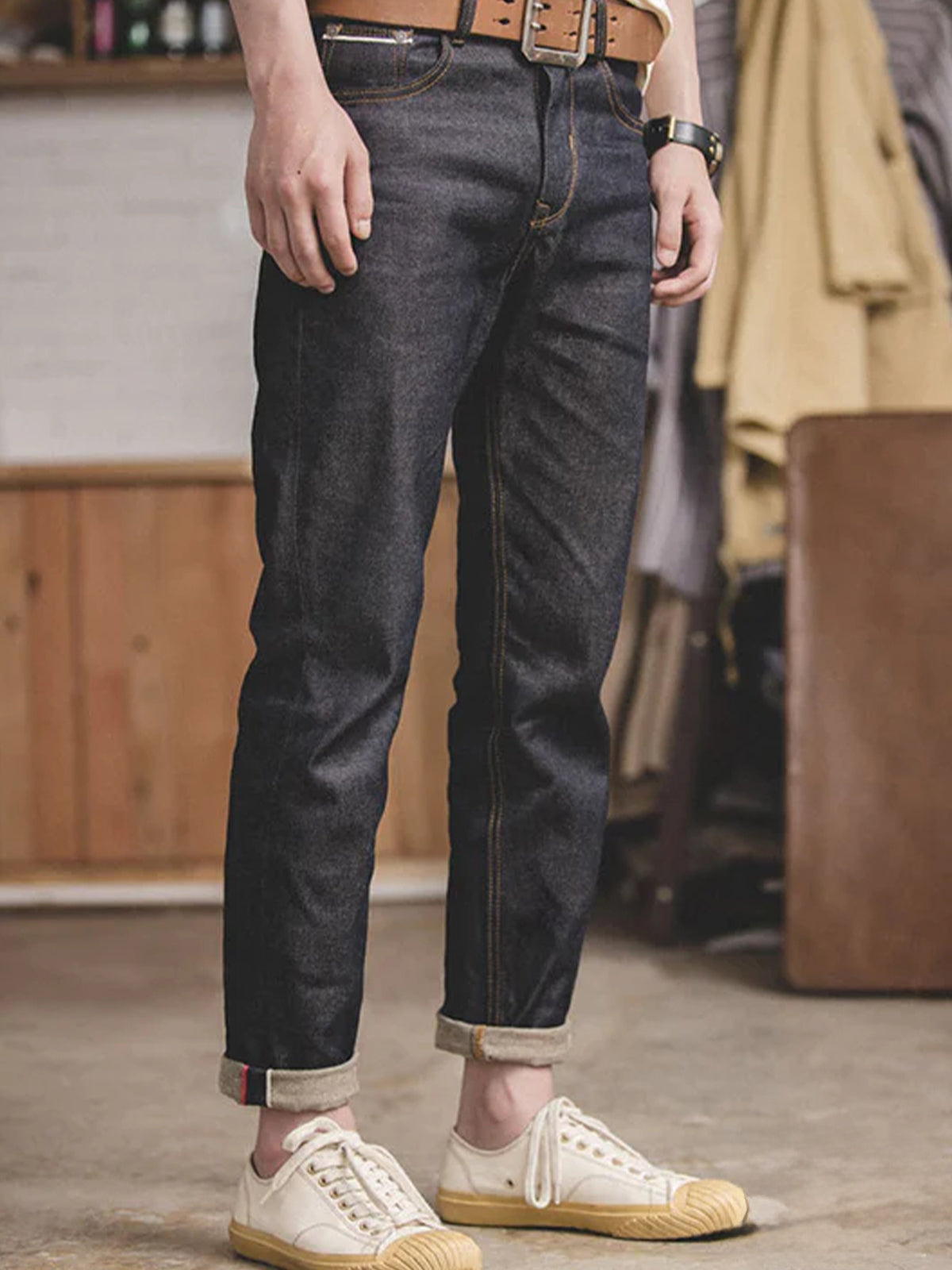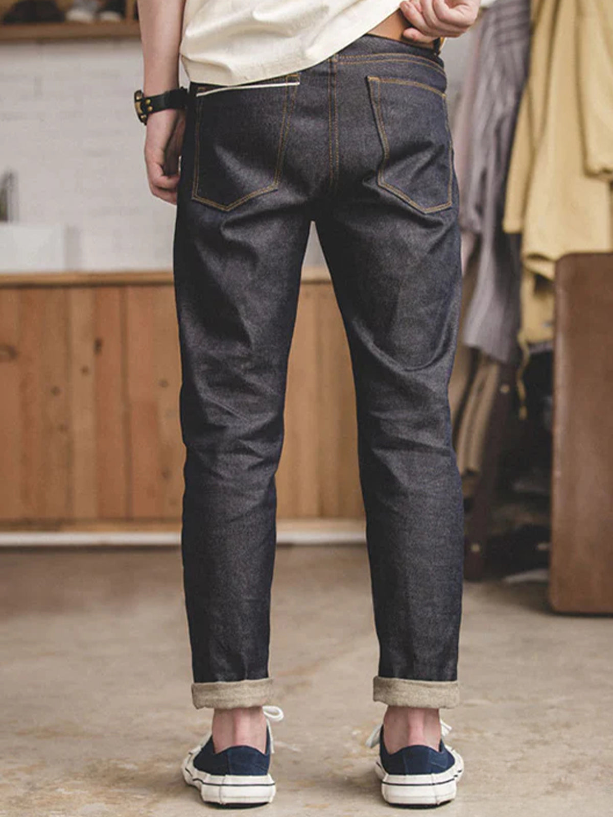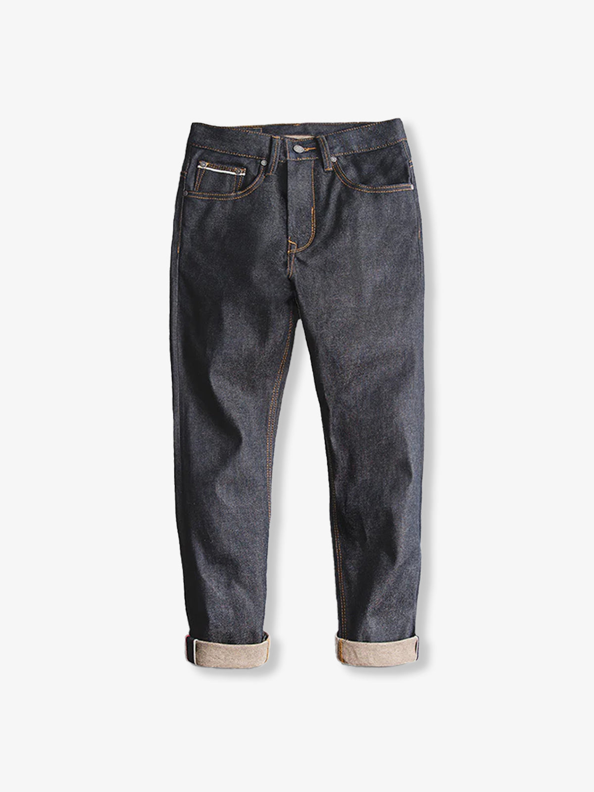 Experience our tapered Jeans, made from natural brown cotton, a nod to its ancient origins. The tapered silhouette provides comfort and a flattering fit, while the double red selvage enhances durability and prevents twisting. Crafted from high-quality indigo-dyed denim with a one-wash finish, these versatile 13.8oz pants pair effortlessly with vintage tees or casual shirts for a stylish, laid-back look.