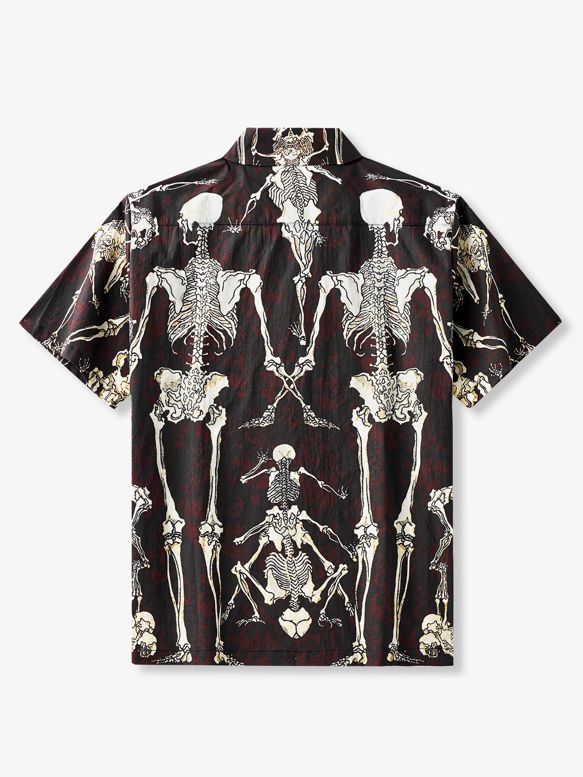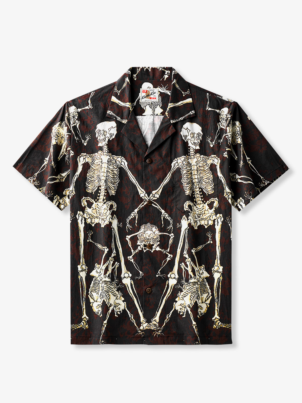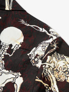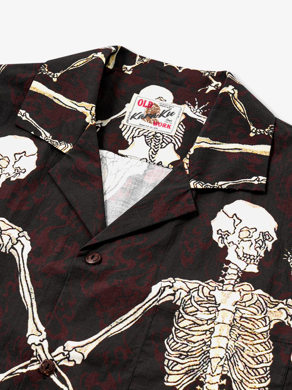 Inspired by renowned Japanese ukiyo-e artist Kawanabe Kyōsai's skull art, embodies a bold reflection on the cycle of life and the strength to embrace both life and mortality with fearless individuality.Crafted from 100% premium cotton, this shirt features a stylish camp collar and a practical chest pocket.Not only soft and durable but also highly breathable and absorbent, ensuring comfort throughout the day.